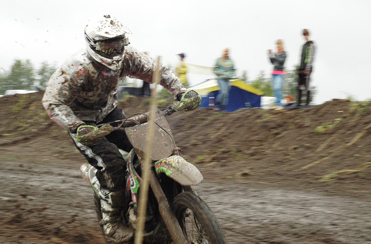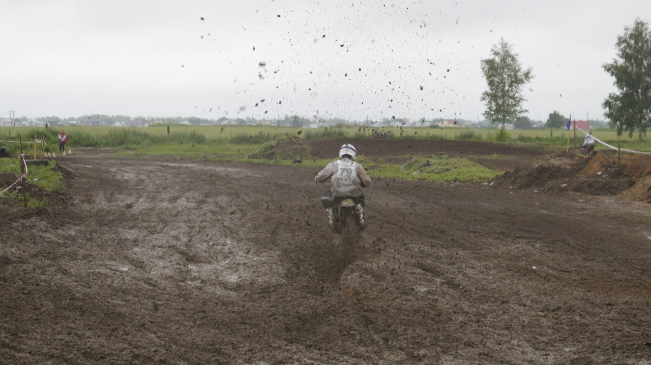 Спортсмены борются с коварством дождя и соответственно трассы, превратившуюся в огромное количество глубоких колей и "мыло", то есть очень скользкую.