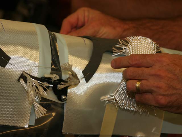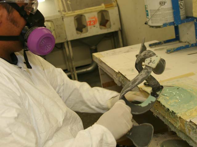 После того как рама сформирована, проклеена, материал полимеризовался и застыл, рабочие осматривают ее на предмет обнаружения дефектов и убирают лишнее (наплывы, напуски стеклоткани, потёки и пр.) оставшееся после процесса полимеризации.