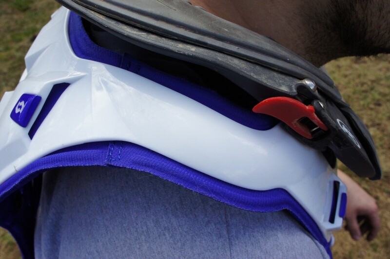 Наплечная часть сконструирована так, что идеально попадает в боковые пазы на брейсе, тем самым брейс и панцирь становятся одним целым. Так же в наплечной части находятся скрытые крепления для стандартных «бубликов» и совместимых с системами внешнего крепления брейсов.
