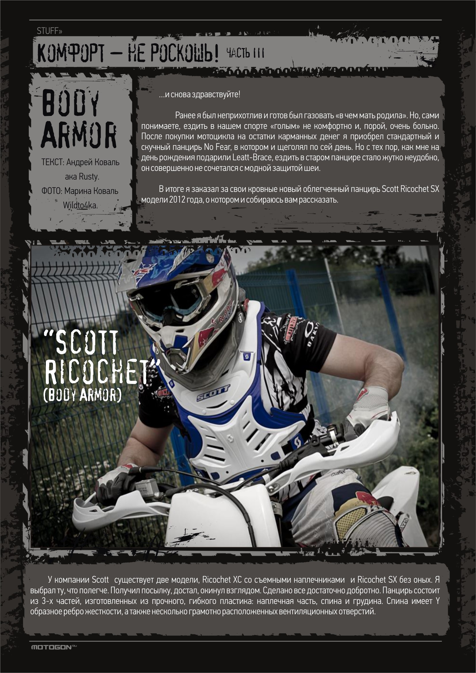 Ранее я был неприхотлив и готов был газовать «в чем мать родила». Но, сами понимаете, ездить в нашем спорте «голым» не комфортно и, порой, очень больно. После покупки мотоцикла на остатки карманных денег я приобрел стандартный и скучный панцирь No Fear, в котором и ездил по сей день. Но - с тех пор как мне на день рождения подарили Leatt-Brace, ездить в старом панцире мне стало жутко неудобно, он совершенно не сочетался с модной защитой шеи. В итоге я заказал за свои кровные новый облегченный панцирь “Scott Ricochet SX” модели 2012 года, о котором и собираюсь вам рассказать.