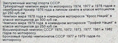 Сколько нового, интересного было на сборах! Мне выдали новенький «Чезет» и амуницию гонщика. Нас обучали самым современным техническим приемам езды на мотоцикле. А главное, каждый день мы выходили на трассу вместе с такими признанными мастерами мотокросса, как Григорьев и Драугс, Калькис и Клявиньш, Казаков и Шинкаренко... Здесь я познакомился с замечательным спортивным педагогом Юрием Игнатьевичем Трофимцом, с которым и по сей день нас связывает крепкая дружба.