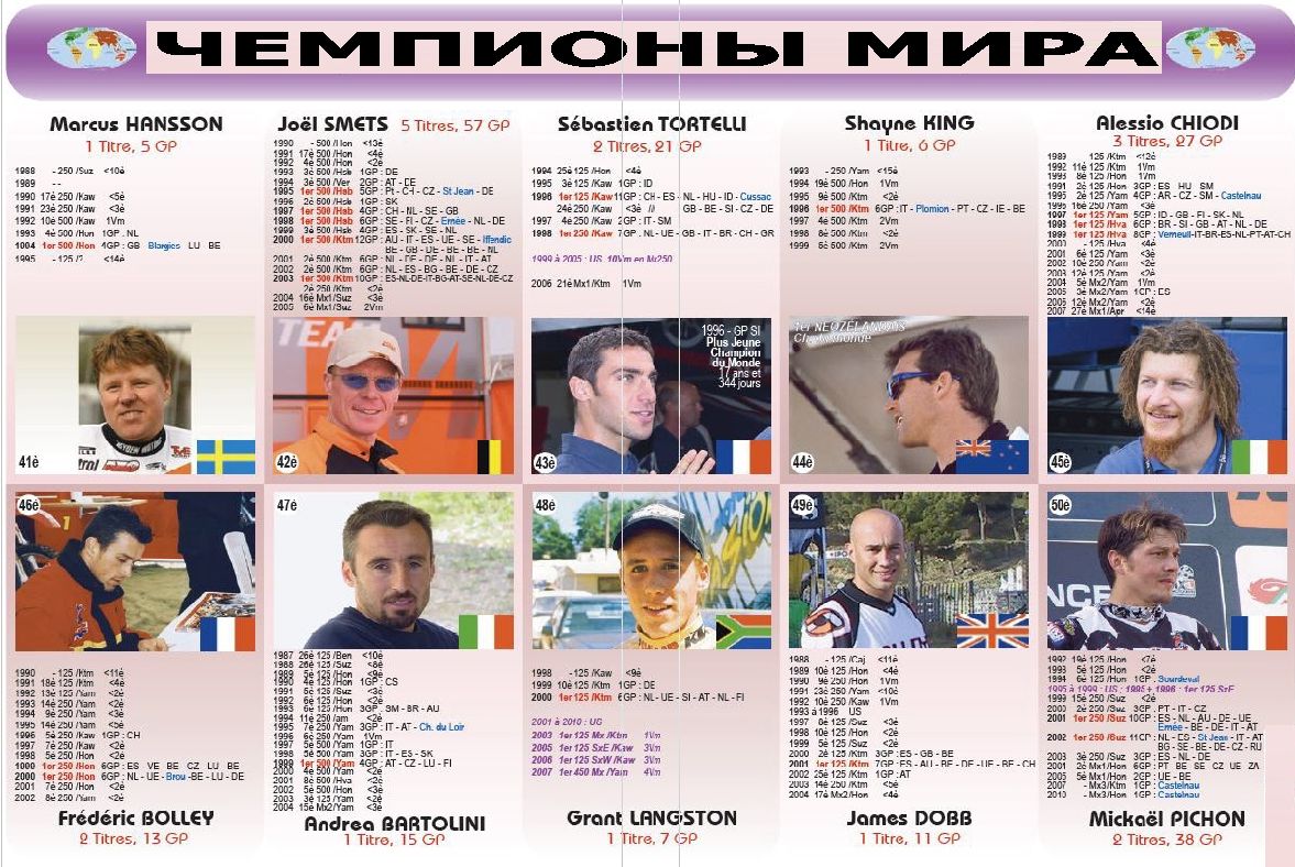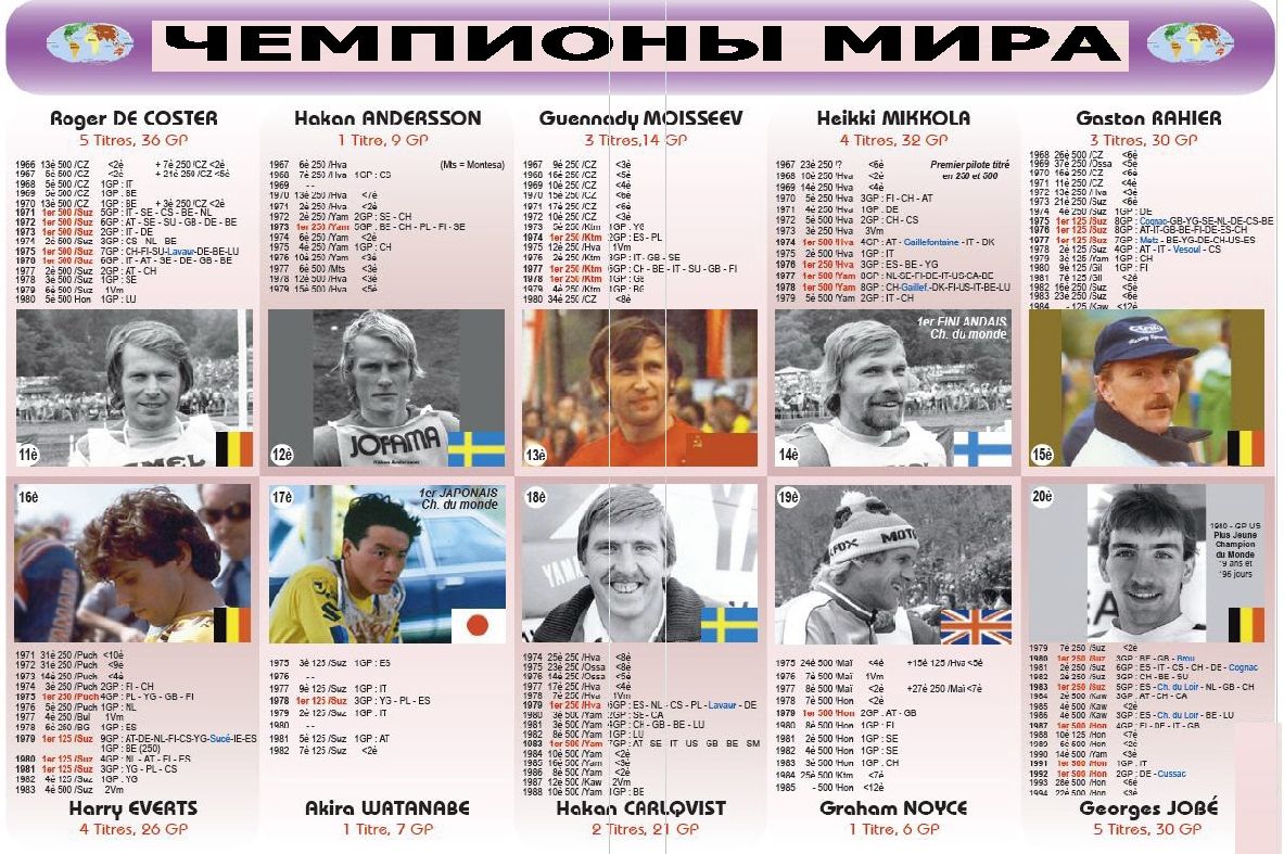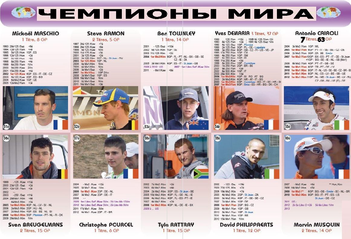 Чемпионы мира 1952-2013гг. 07.11.2013 Роман Мишенев (_) В вашу коллекцию - все чемпионы мира за всю историю мотокросса... Комментарии Комментарии к этой статье запрещены.