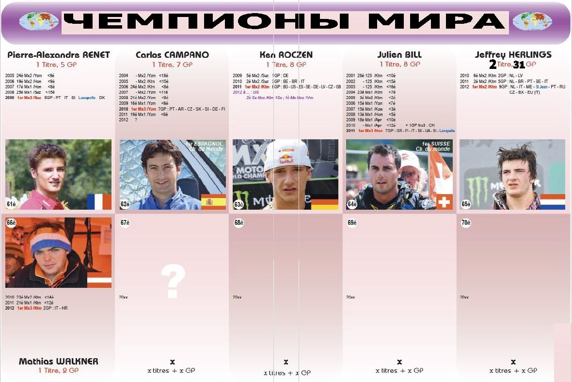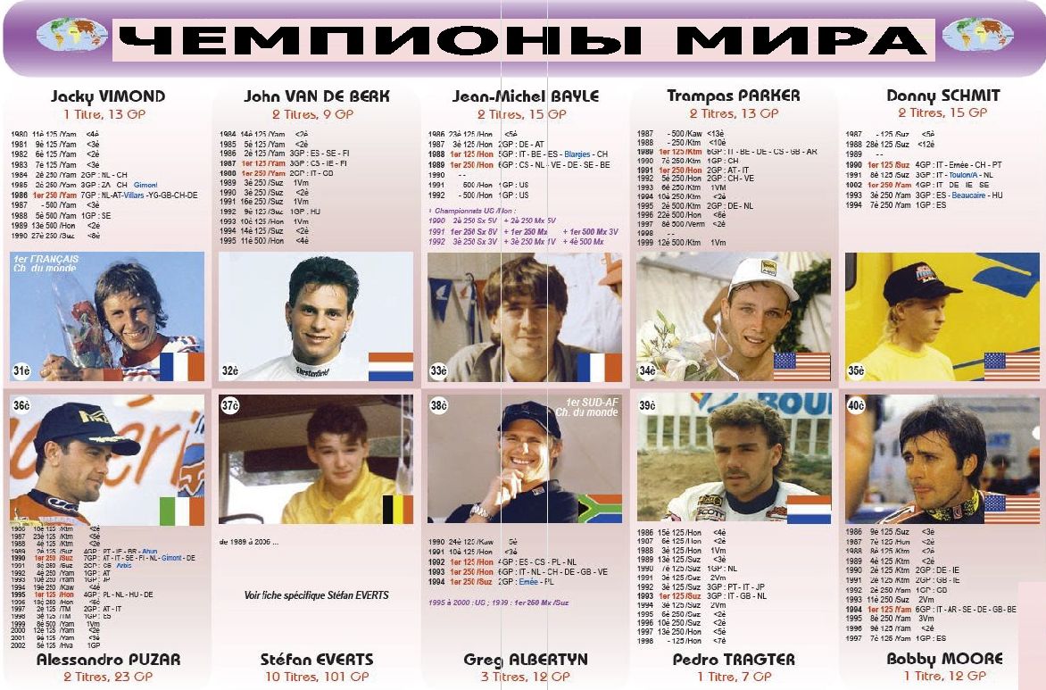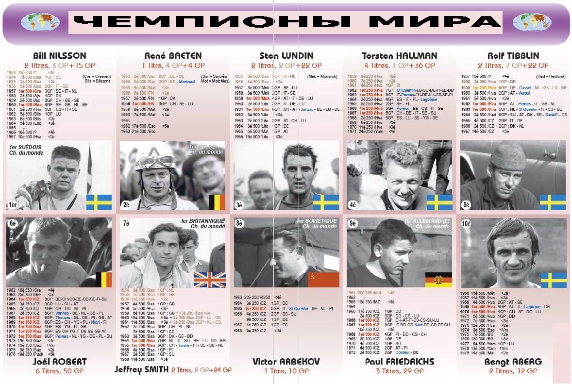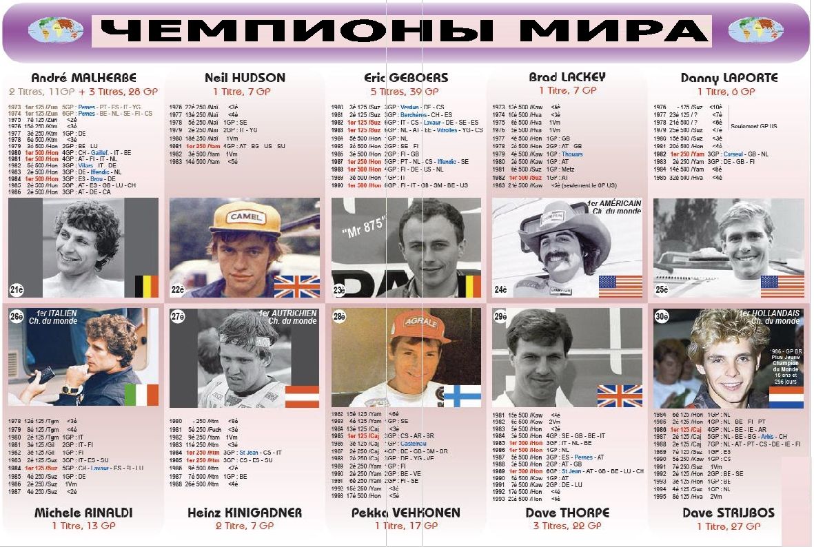 Чемпионы мира 1952-2013гг. 07.11.2013 Роман Мишенев (_) В вашу коллекцию - все чемпионы мира за всю историю мотокросса... Комментарии Комментарии к этой статье запрещены.