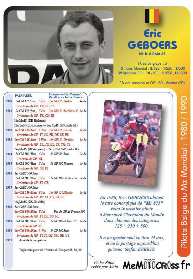 Пятикратный чемпион мира, легенда мирового мотокросса бельгиец  Эрик Гебоерс, известный как  "The Kid" и "Mr. 875". Единственный гонщик в истории выигравший титулы чемпиона мира во всех трех классах мотоциклов 125, 250 и 500сс