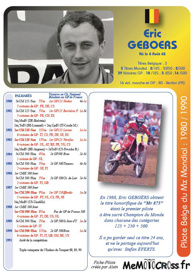 Легенды МХ: Эрик Гебоерс. 09.11.2013 Роман Мишенев (_) Карьера легендарного бельгийца в слайд-шоу... Пятикратный чемпион мира, легенда мирового мотокросса бельгиец Эрик Гебоерс, известный как "The Kid" и "Mr. 875". Единственный гонщик в истории выигравший титулы чемпиона мира во всех трех классах мотоциклов 125, 250 и 500сс Комментарии Комментарии к этой статье запрещены.