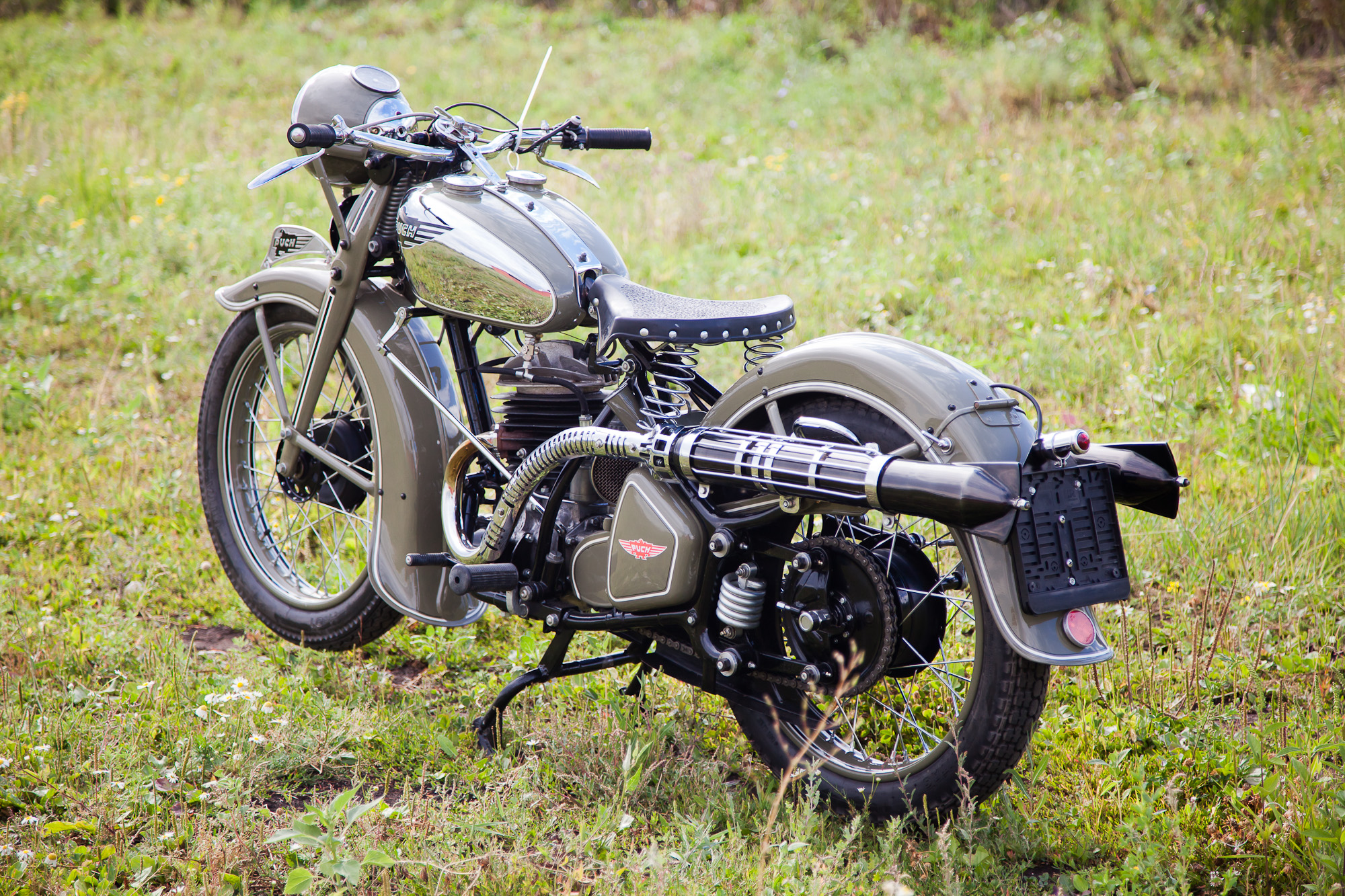 Трудно сказать, что подсказало создателям мотоцикла именно такую компоновку, но она оказалась на редкость удачной. Мало того, цепная передача приводила не только заднее колесо, но и сцепление, которое размещалось в задней ступице. Машина оказалась на редкость удачной и строилась до 1942 года. За это время ее мощность поднялась с б до 10,5 л.с.