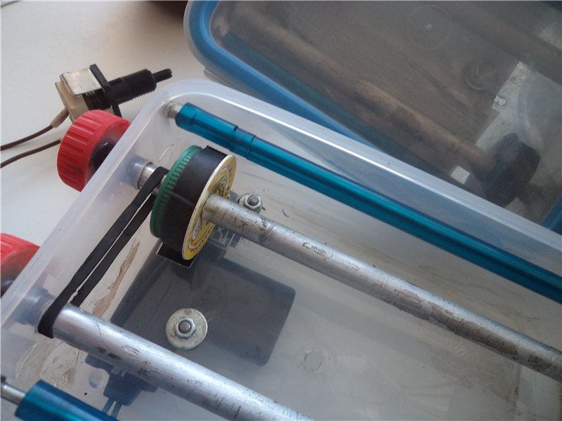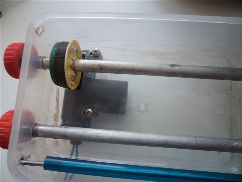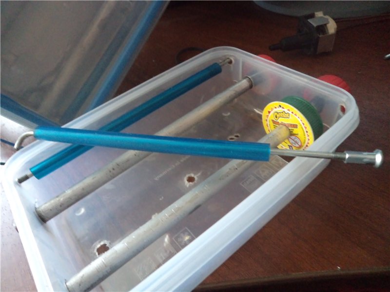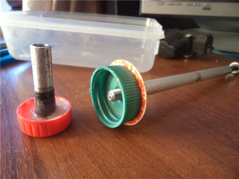 в качестве валов на которые мотается легенда использовал две аллюминиевые трубки (бывший шомпол от ружья), там уже была резьба... один вал сделан разборным - в месте соединения пробка от баночки антифриза ... ну тут всё видно...