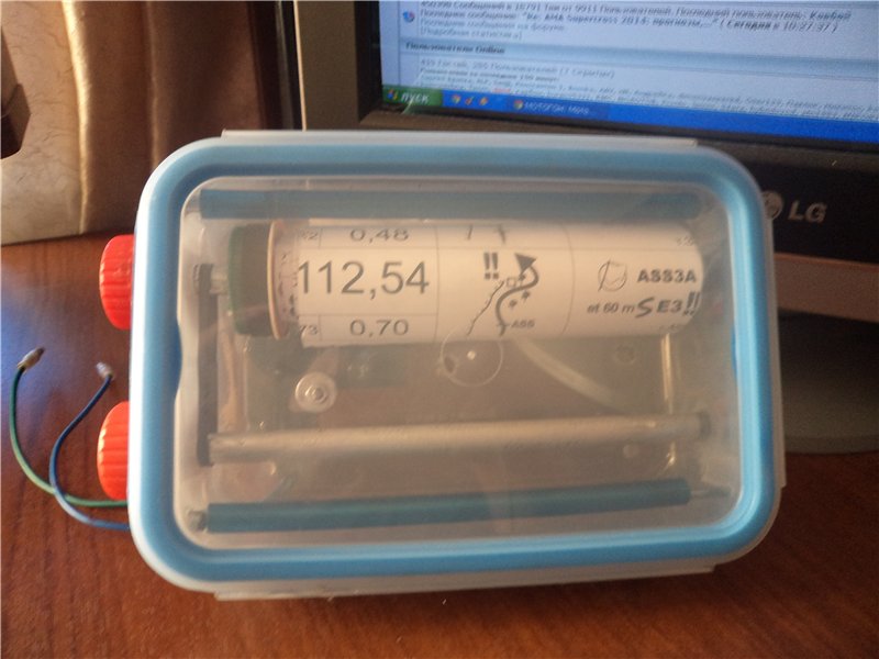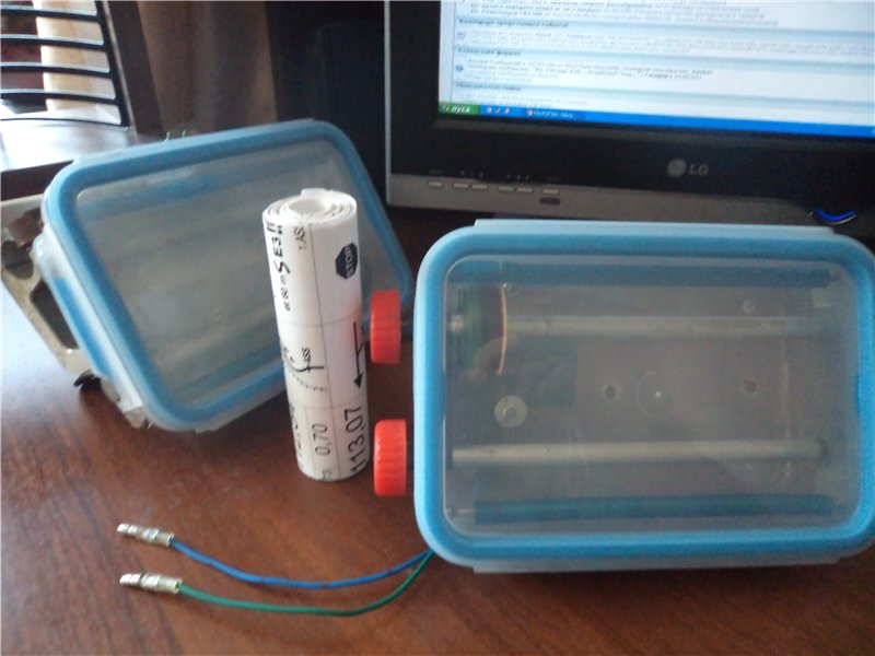 запихиваем всё в "коробочку". на одну сторону пробочки от кока-колы поксиполом приклеил (чтоб вручную удобней мотать было). с другой стороны болтики, ну чтоб конструкция не разваливалась :)