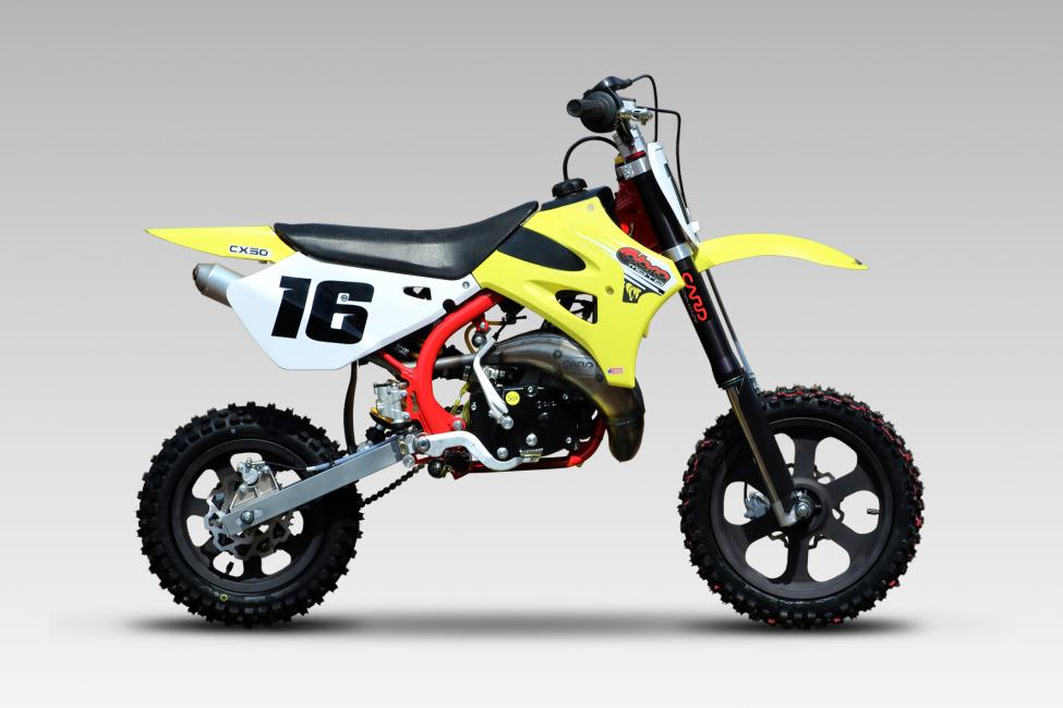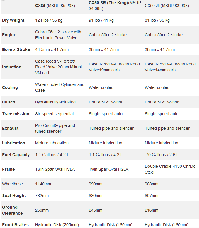 Самый маленький в линейке – это CX50JR. Он имеет уникальное шасси и предназначен исключительно для маленьких гонщиков. Увеличен ход подвески, он почти на 50 мм больше, чем у своего ближайшего конкурента, сохраняя при этом необходимую высоту сиденья, которая регламентирована в правилах АМА.