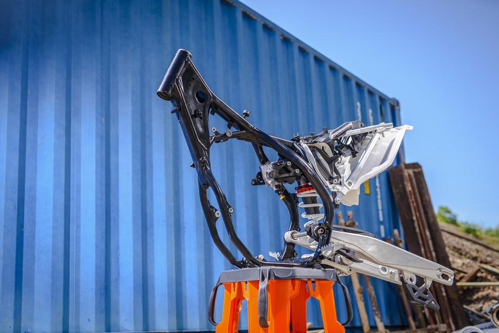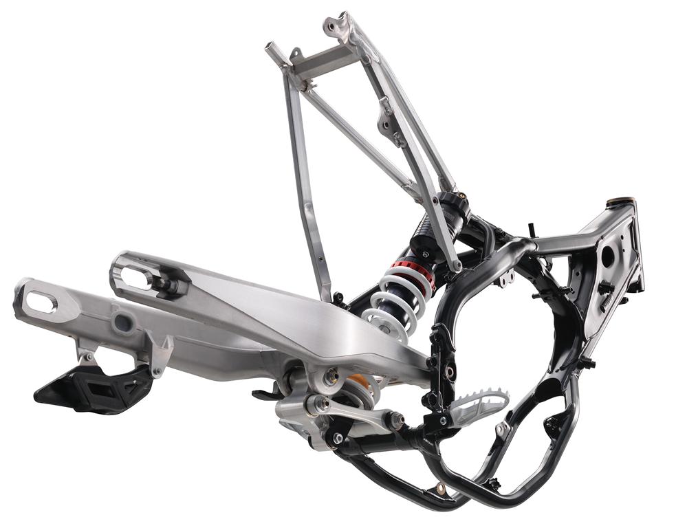 Вся кроссовая «взрослая» линейка обзавелась новым хромомолибденовым «скелетом». Инженерам удалось снизить ее вес и увеличить жесткость, в том числе и за счет подрамника измененной конструкции, и нового заднего маятника. Также на всех мотоциклах семейства теперь установлен совершенно новый задний амортизатор компании White Power. Новая конструкция, пластик и кованые алюминиевые элементы существенно уменьшили вес, а использование компенсационной камеры большего размера позволило более эффективно охлаждать масло при его работе.
