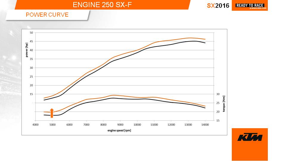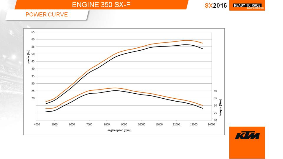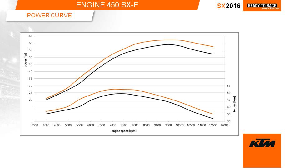 KTM 450 SX-F, тоже обзавелся новой силовой установкой. Двигатель также получил новый компактный и легкий картер двигателя. Коленчатый вал, облегченный на 100 г., обладает на 13% большей инерцией, чем его предшественник, а новый короткий цилиндр и шатун позволили избавиться от нежелательных паразитных вибраций. Головка цилиндра с газораспределительным механизмом SOHC и одним(!) распредвалом дала возможность мотору похудеть еще на 350 г. Бороться с лишним весом также помогают четыре титановых клапана на впуске и выпуске и облегченное сцепление DDS с интегрированной системой внутреннего демпфирования. Мотоцикл оборудуется гидравлическим приводом сцепления Brembo и новой коробкой передач (четырехступенчатой для Европы и пятиступенчатой для США). Максимальная мощность нового мотора составляет более 62 л.с., крутящий момент – более 52 Нм. В общем и целом, по сравнению с предыдущими моделями, он «похудел» на 1,8 кг. Теперь силовая установка короче на 23 мм, ниже на 9 мм, и тоньше на 27 мм, при улучшенных показателях централизации масс.