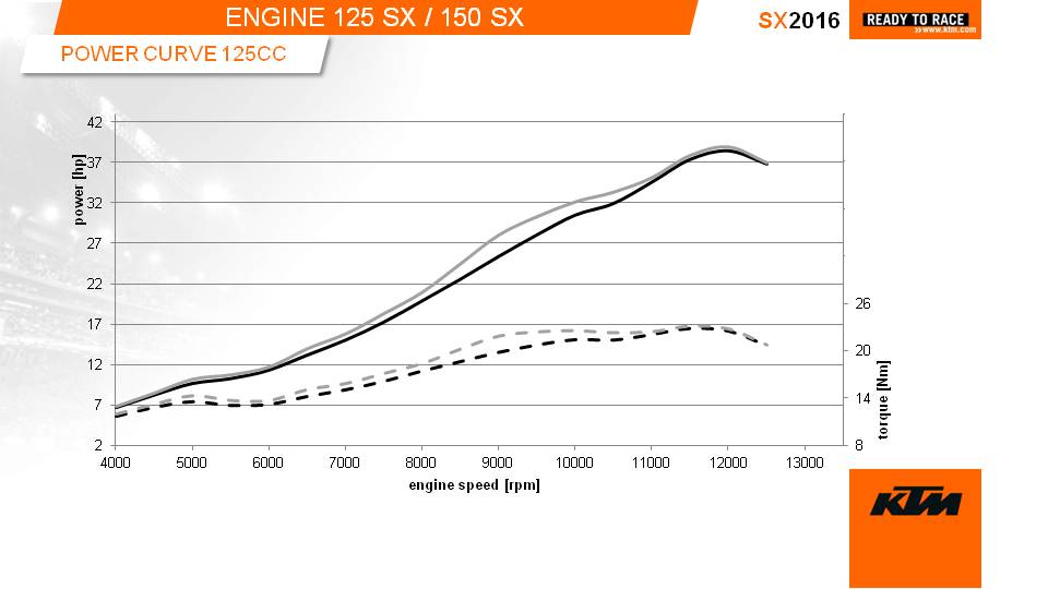 Двухтактное семейство тоже было подвергнуто радикальному улучшению. У KTM 125/150 SX тоже появился новый двигатель. Компактный картер, сбросивший лишние 600 г., новый цилиндр, шатунная сборка и совершенно новая шестиступенчатая коробка передач облегчили новый мотор на 2 кг! Менять свою двухтактную 250-ку в 2016 году австрийцы не стали, отшутившись, что этот мотоцикл и так практически идеален. Детские модели также не изменились, лишь обзавелись обновленными сиденьями, фирменным защитным пластиком в новом корпоративном стиле и некоторыми, не столь значительными инженерными нововведениями.