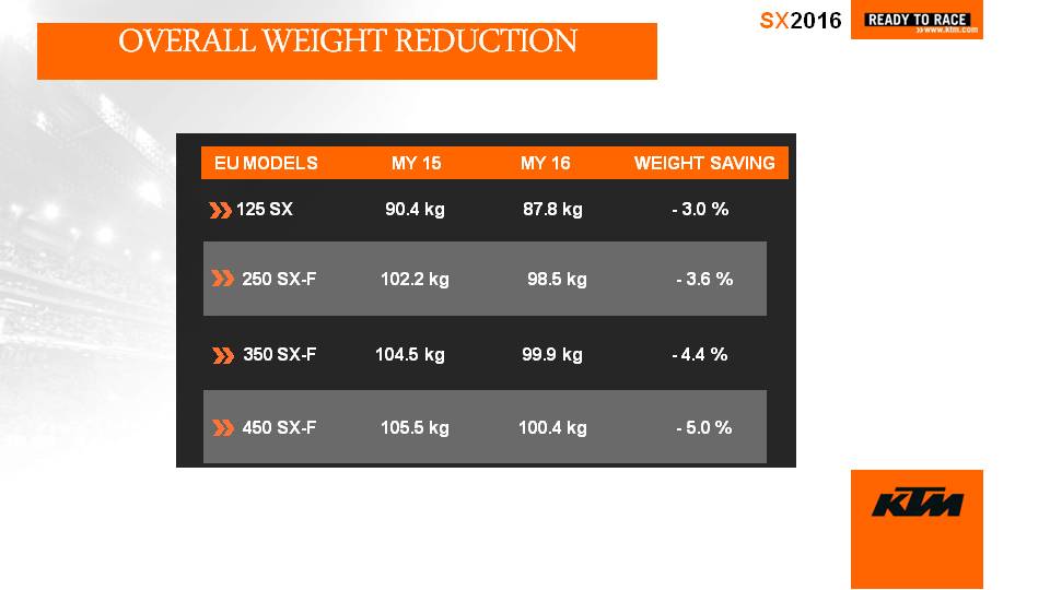 Благодаря всем этим усилиям, кроссовые модели КТМ 2016 модельного года, обладают уникальными соотношениями веса и мощности своих мотоциклов. Судите сами: двухтактный 125 SX «похудел» на 3% и стал весить 87,8 кг! Классическая «250-ка» сбросила 3,6% и теперь щеголяет рекордными 98,5 кг сухой массы. Инновационная модель 350 SX-F «усохла» на 4,4 % и показывает на весах 99,9 кг! И наконец чемпионский 450 SX-F демонстрирует свои 100,4 кг общей массы. Насколько мне известно, это рекордные значения среди всех серийно выпускаемых кроссовых мотоциклов.