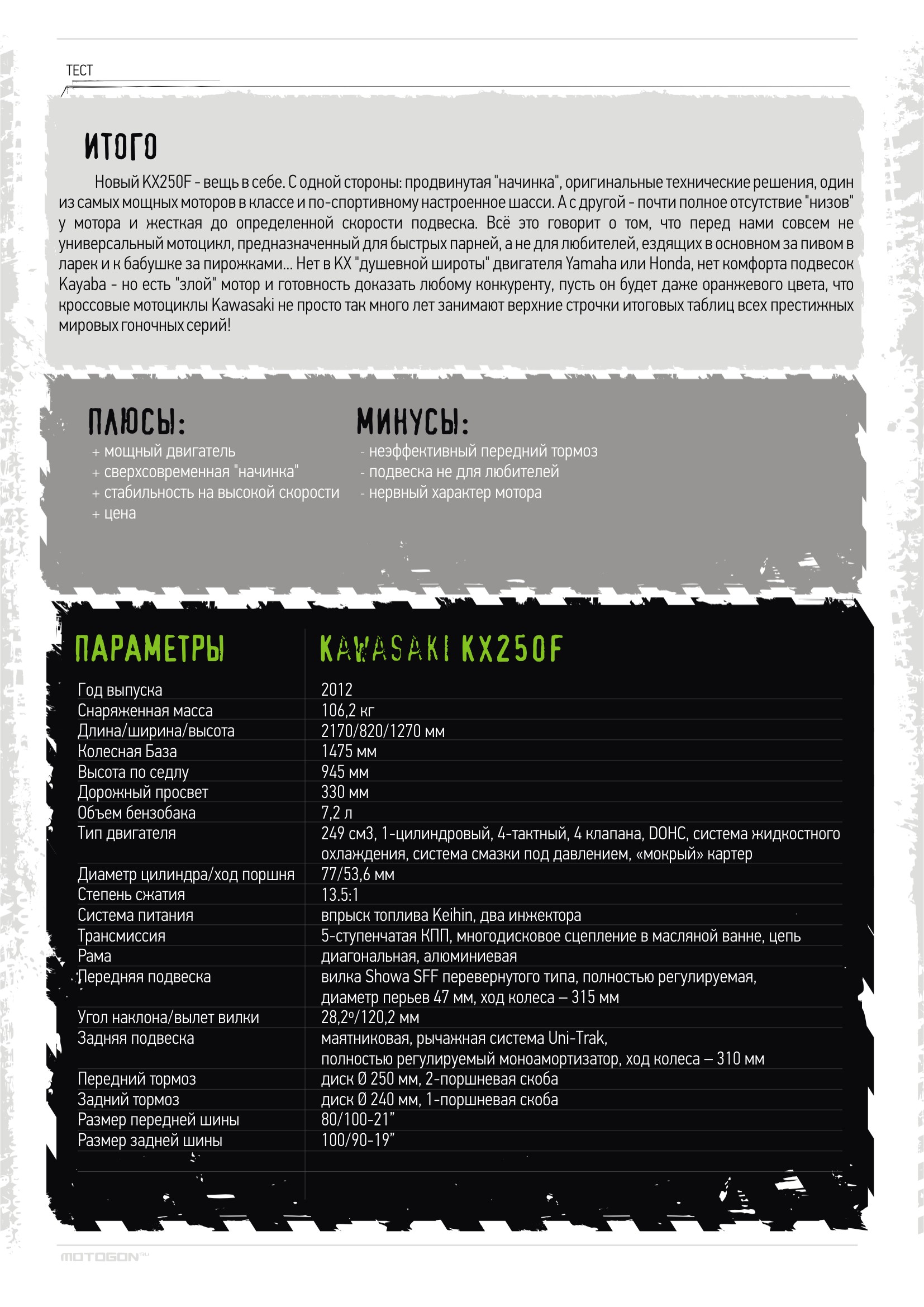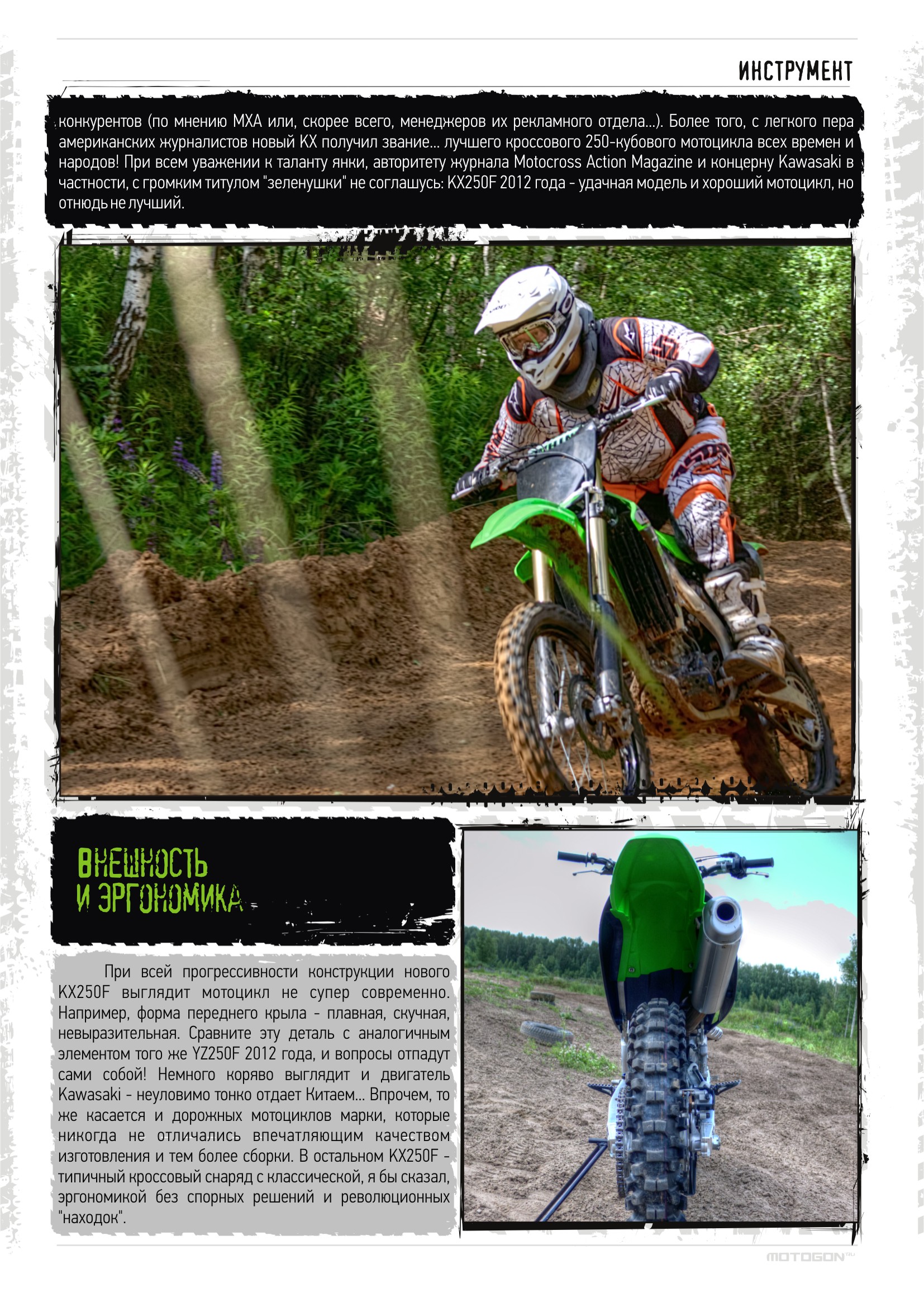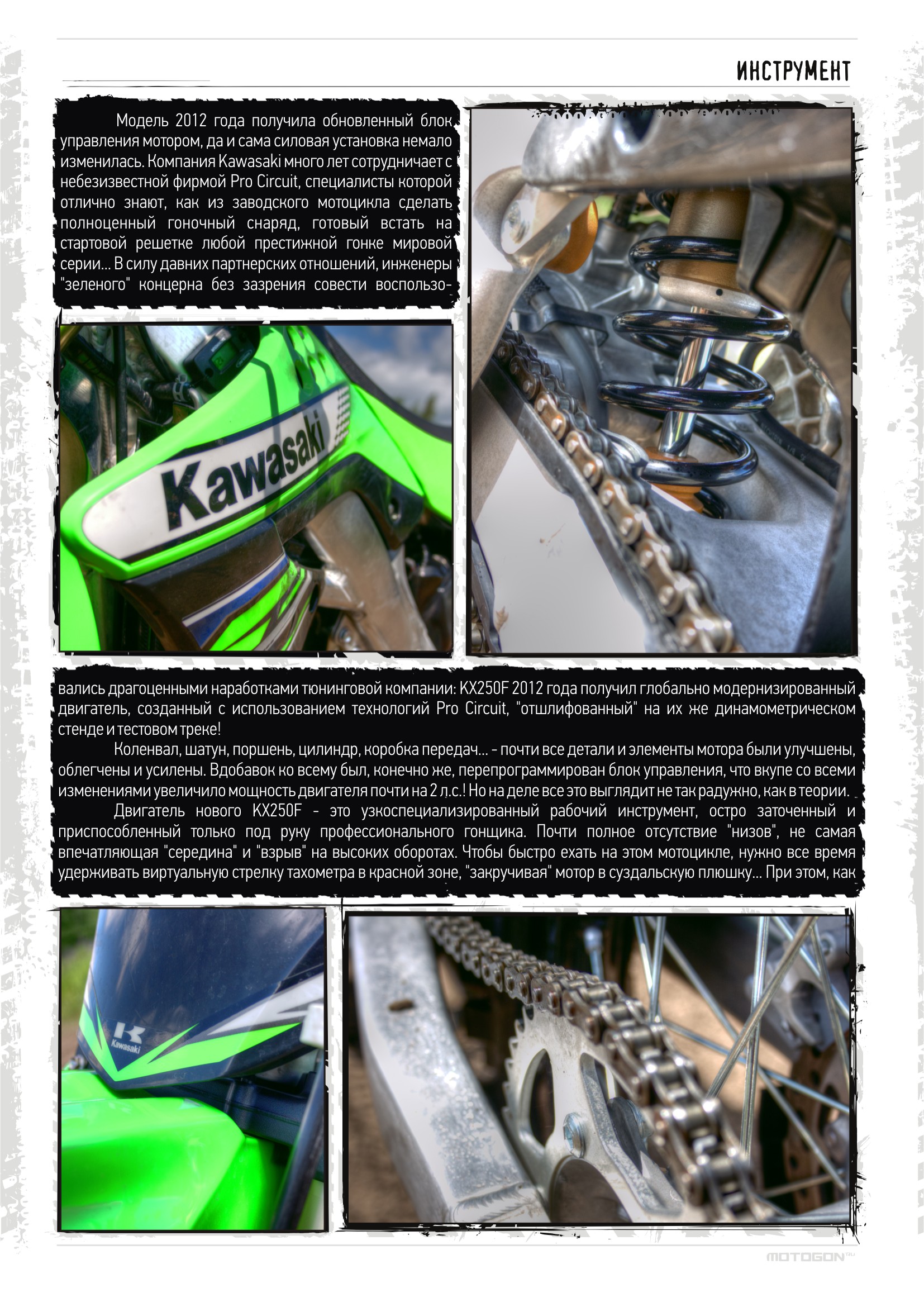 Прогресс – забавная штука! С каждым годом мотоциклы становятся легче, мощнее, надежнее и привлекательнее; лучшие инженеры день и ночь трудятся над улучшением характеристик и усовершенствованием конструкций... Постоянная работа над ошибками! И все знают, что пройдет какое-то время, и появится новая, более продвинутая модель. Знали это и в компании Kawasaki, когда в прошлом году выпускали во многом революционный KX250F, удостоившийся звания лучшего 250-кубового кроссового мотоцикла по версии нескольких авторитетных американских журналов... Но настал 2012 год, и «зеленый» концерн нашел, что улучшить в успешной модели!