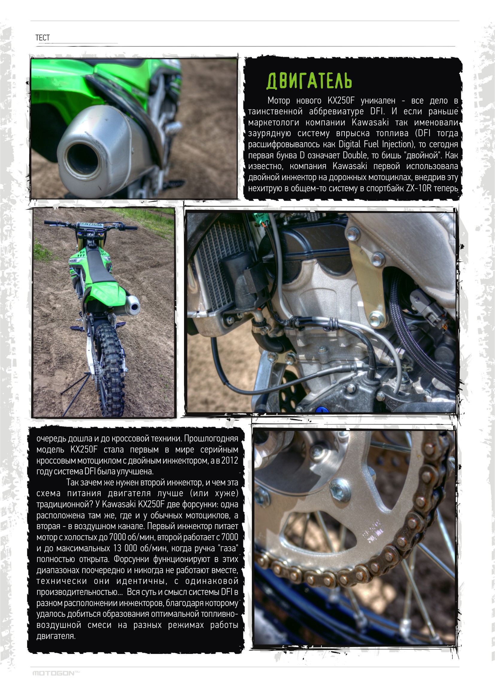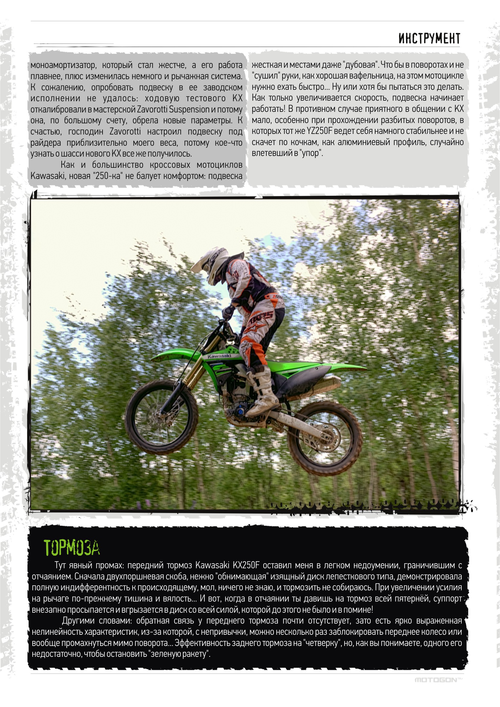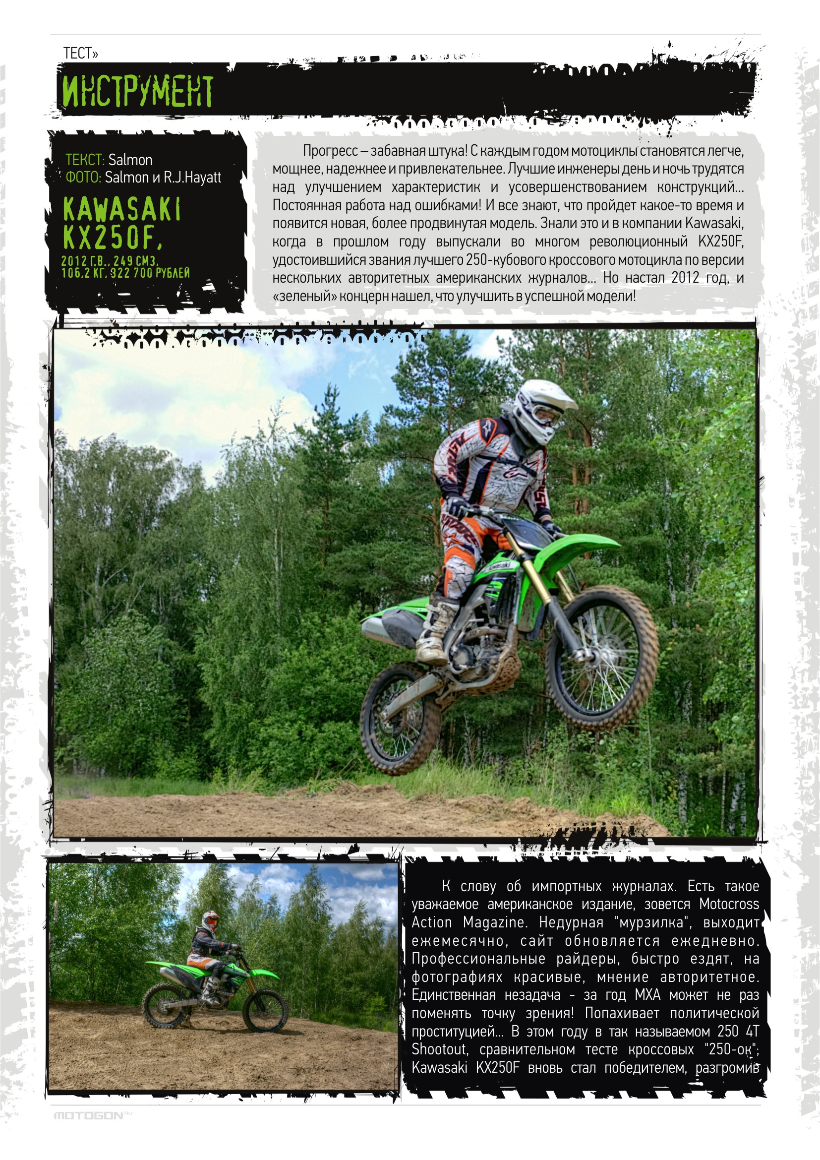 Прогресс – забавная штука! С каждым годом мотоциклы становятся легче, мощнее, надежнее и привлекательнее; лучшие инженеры день и ночь трудятся над улучшением характеристик и усовершенствованием конструкций... Постоянная работа над ошибками! И все знают, что пройдет какое-то время, и появится новая, более продвинутая модель. Знали это и в компании Kawasaki, когда в прошлом году выпускали во многом революционный KX250F, удостоившийся звания лучшего 250-кубового кроссового мотоцикла по версии нескольких авторитетных американских журналов... Но настал 2012 год, и «зеленый» концерн нашел, что улучшить в успешной модели!
