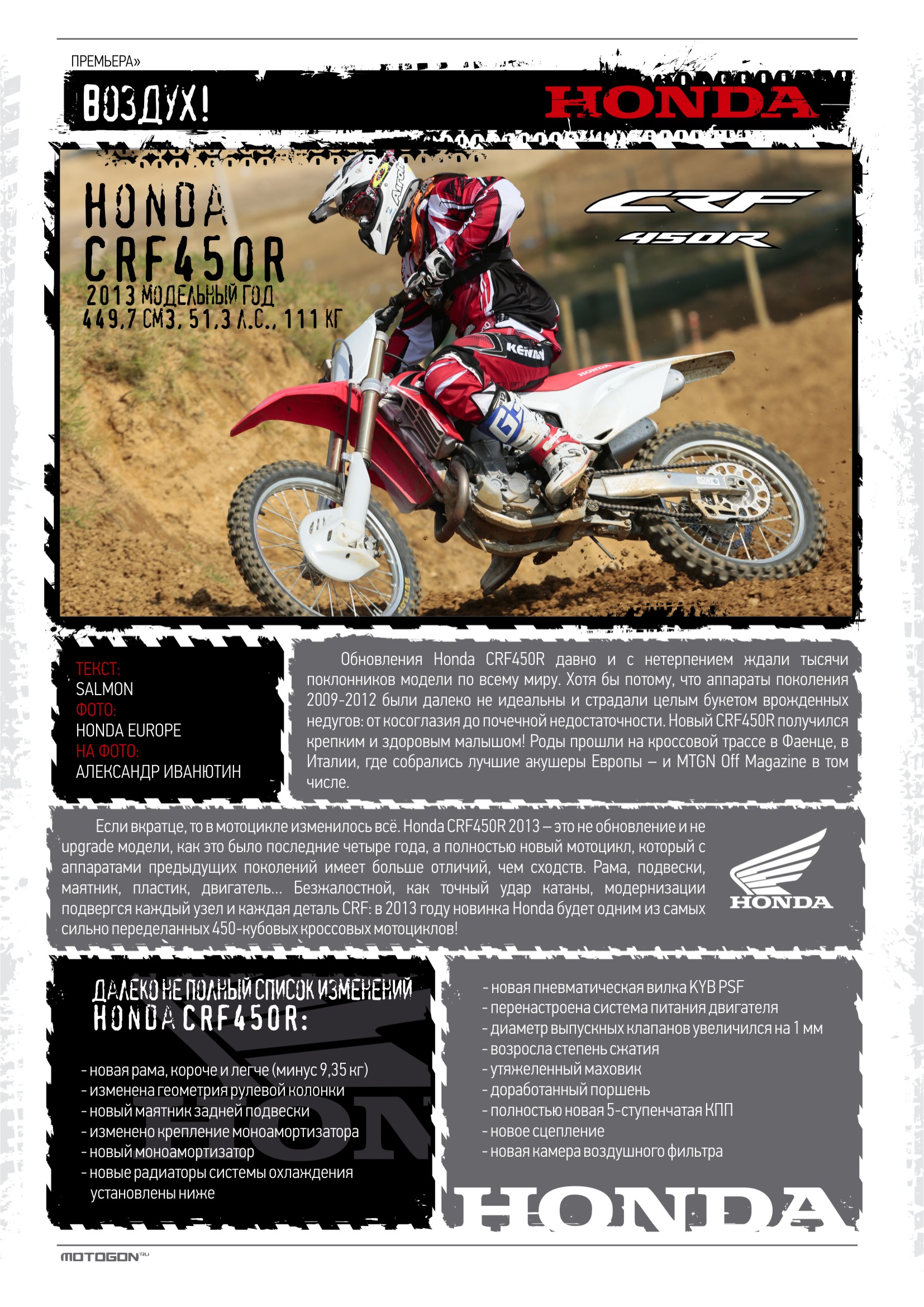 Обновления Honda CRF450R давно и с нетерпением ждали тысячи поклонников модели по всему миру. Хотя бы потому, что аппараты поколения 2009-2012 были далеко не идеальны и страдали целым букетом врожденных недугов: от косоглазия до почечной недостаточности. Новый CRF450R получился крепким и здоровым малышом! Роды прошли на кроссовой трассе в Фаенце, в Италии, где собрались лучшие акушеры Европы – и MTGN Off Magazine в том числе.