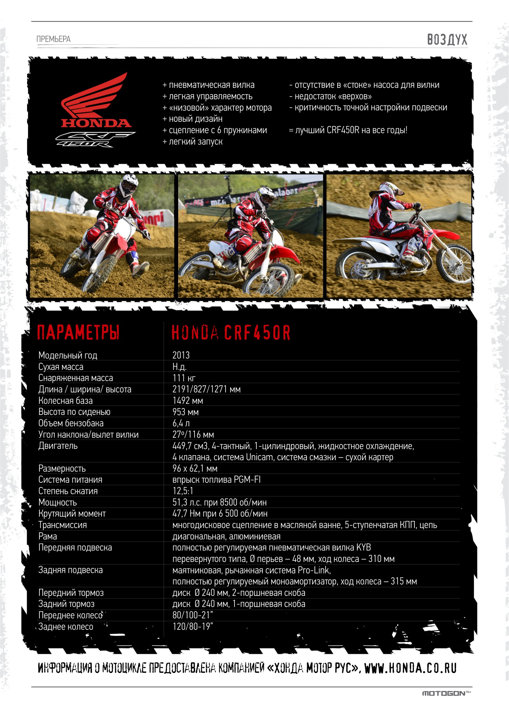 Honda CRF450R, 2013 модельный год, 449,7 см3, 51,3 л.с., 111 кг