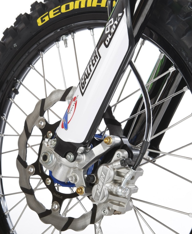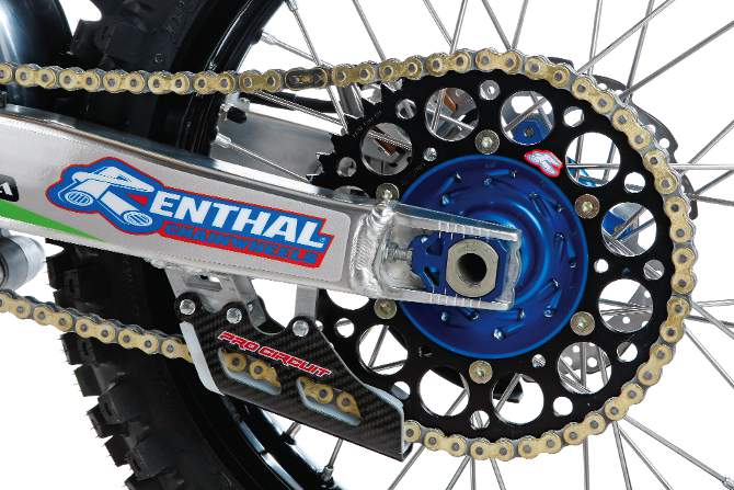 На мотоцикл была установлена резина Dunlop Geomax: MX31 спереди ($ 56.95) и MX51 сзади ($ 135.95). А для эффективного торможения, Фил выбрал передний тормозной диск Galfer Tsunami, диаметром 270мм, а также кронштейн адаптера и тормозные колодки ($ 339). Задняя алюминиевая звезда от Renthal Ultralite на 50-зубьев, обошлась $ 64.95, плюс цепь Renthal 520 R1 ($ 77.95). Чтобы сохранить цепочку в пути, Фил добавил ловушку цепи Pro Circuit ($ 299,95.) Как итог еще $ 975.