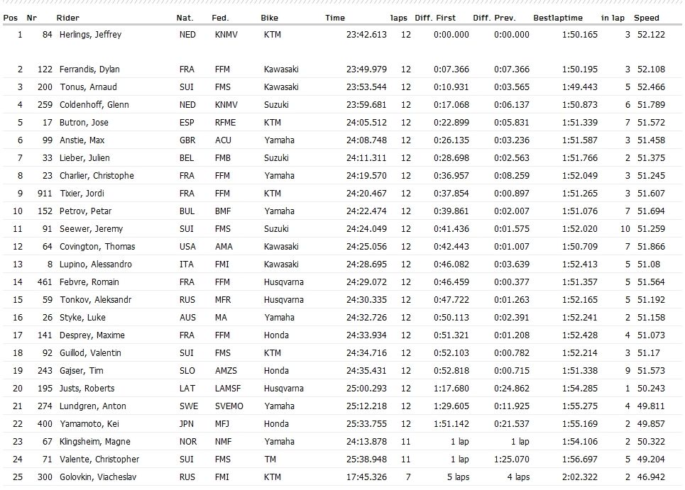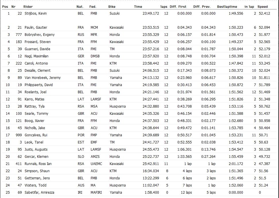 Российские гонщики Евгений Бобрышев (MX1) и Александр Тонков (MX2) финишировали на третьей и пятнадцатой позициях соответственно, а у Вячеслава Головкина сход.