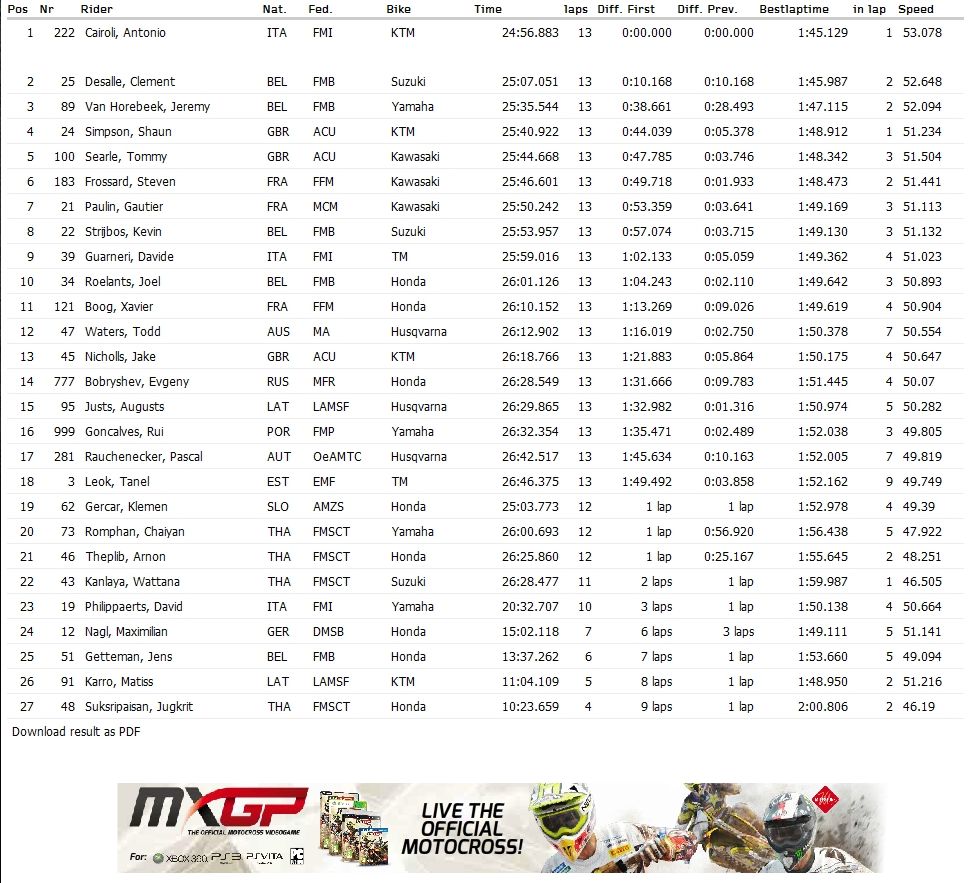 В классе MXGP первое место в квалификации занял итальянец Тони Кайроли. Второе и третье места у бельгийцев Клемента Десалля и Джереми Ван Хорбика.  Российский пилот Евгений Бобрышев закончил квалификацию на четырнадцатой позиции.