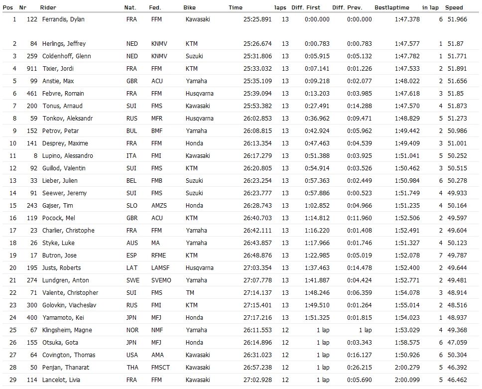 В классе MX2 в квалификационном заезде первым финишировал француз Дилан Феррандис. Менее секунды ему уступил голландец Джеффри Херлингс. На третьей позиции голландец Гленн Колденхофф,  Россиянин Александр Тонков финишировал на восьмой позиции.