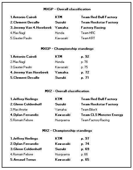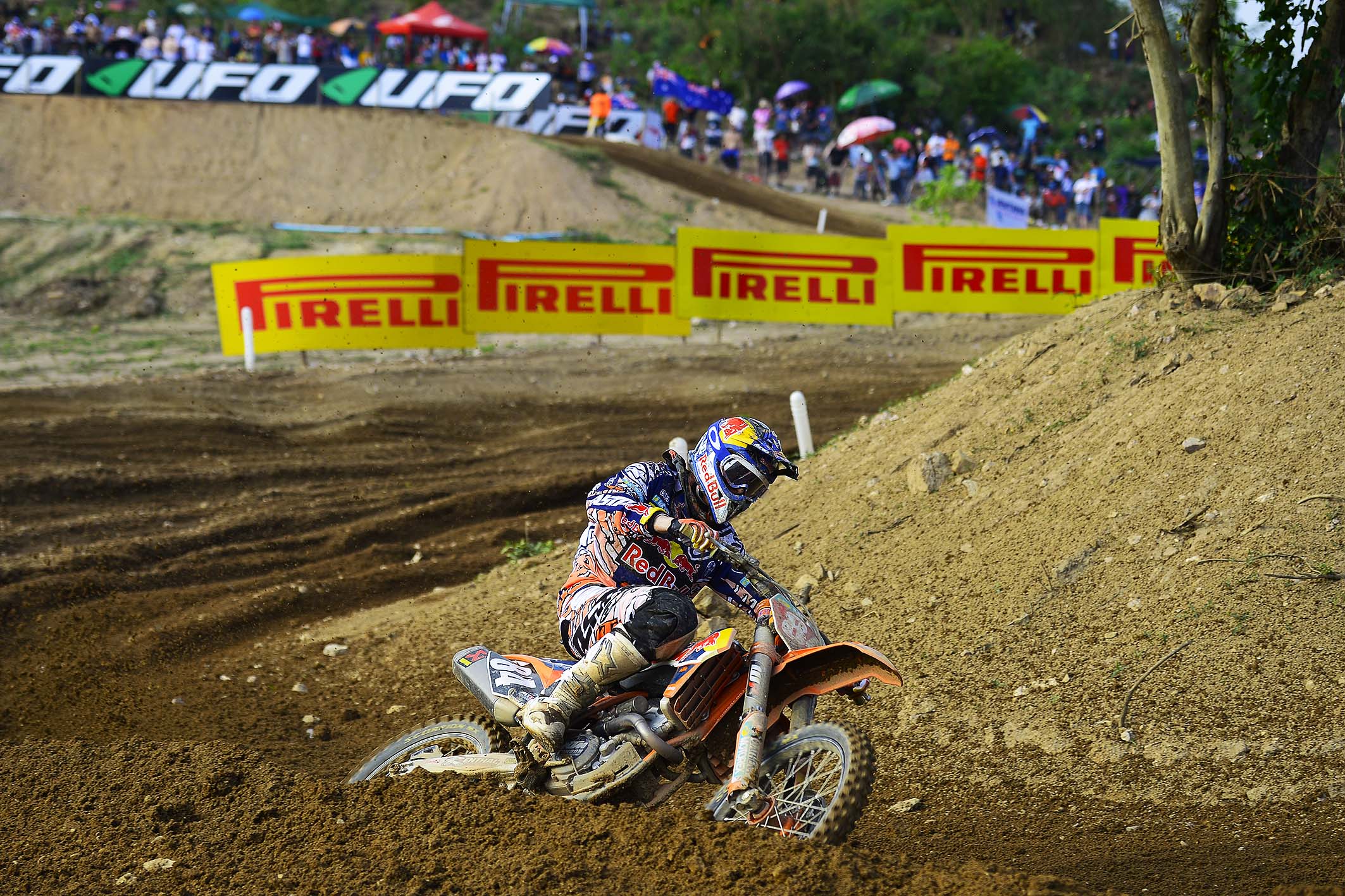 В премьер-классе действующий чемпион мира Антонио Кайроли сделал серьезную заявку на восьмой титул: в Си Раче он одержал фантастическую двойную победу и вернул себе лидирующее положение в классе. Выбрав шину Pirelli SCORPION™ MX MidSoft 32 для переднего и заднего колес (аналогичный выбор сделали и другие гонщики Pirelli), гонщик заводской команды KTM доказал, что выздоровел после недавней травмы лодыжки. Он опередил гонщика Suzuki Клемана Десалля и Джереми Ван Хорбика из команды Yamaha, впервые поднявшегося на подиум. Все места на подиуме в классе MXGP подчеркнули выдающиеся характеристики шины SCORPION™ MX на красном грунте таиландской трассы, который местами был рыхлым, а местами — уплотненным. Неудачным уик-энд оказался для второго гонщика заводской команды Suzuki Кевина Страйбоса, который ехал на пятой позиции в гонке № 2, но из-за технической неисправности откатился назад. Томми Сирл упал в первом заезде и сломал запястье.