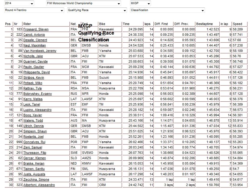 Только, что закончились квалификационные заезды Гран-При Италии, четвертого этапа Чемпионата мира 2014, который проходит в эти выходные на треке в Арко Ди Тренто. В классе MXGP лучшее время показал француз Стивен Фроссард. Российский пилот Евгений Бобрышев на 13-м месте.