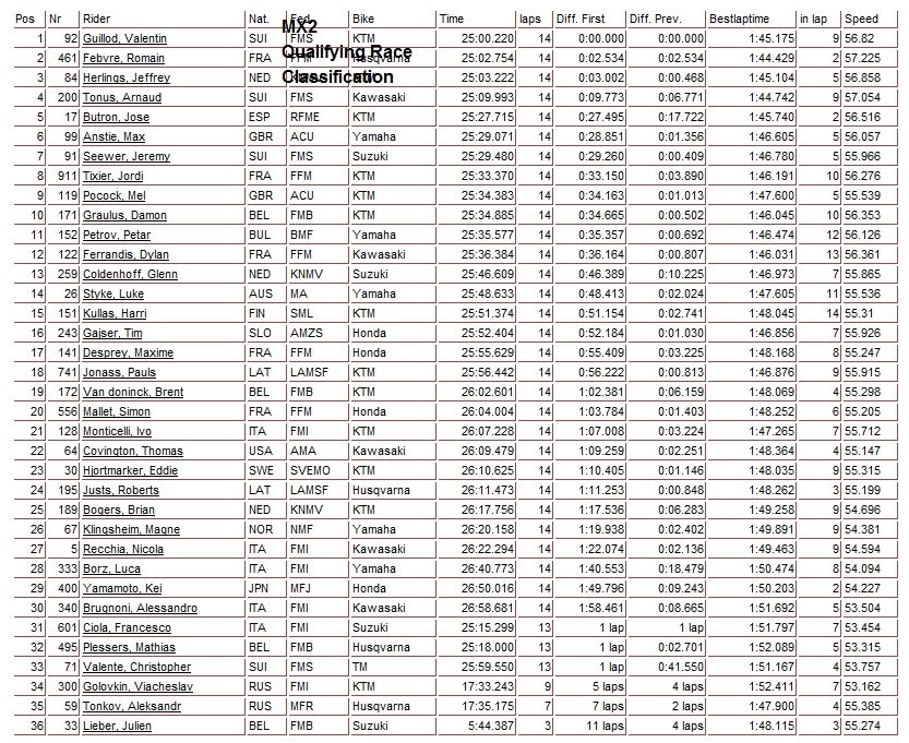 В классе МХ2 лучшее время у швейцарца Валентина Гуилода. Российские гонщики Александр Тонков и Вячеслав Головкин квалификацию не закончили.