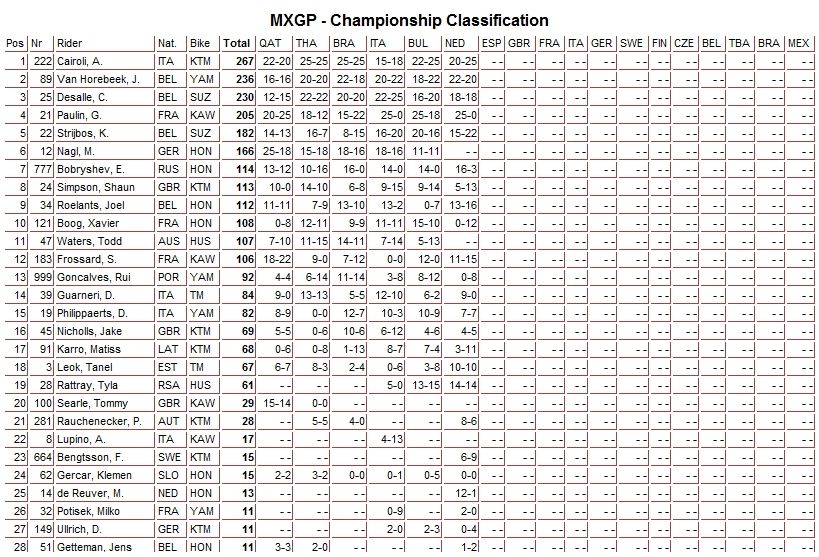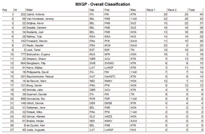 Победителем в классе MXGP стал итальянец Антонио Кайроли. Российский пилот Евгений Бобрышев занял общее 10-е место.