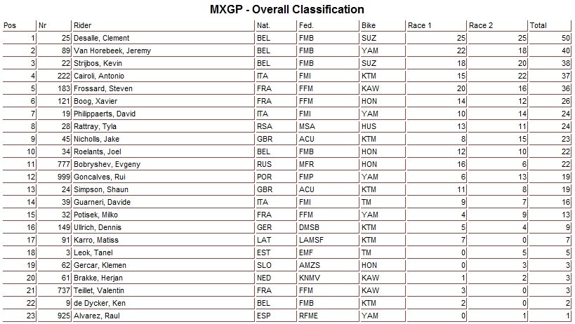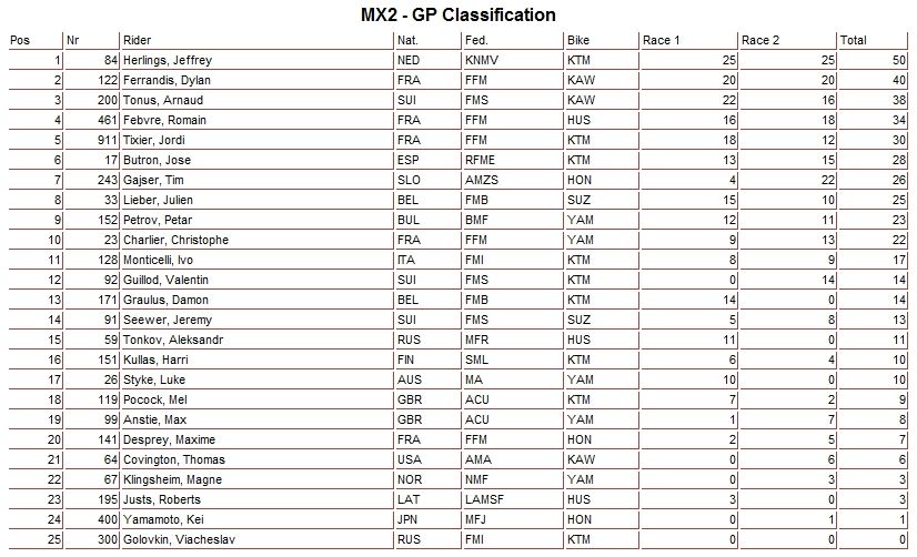 Победителями этапа стали - голландец Джеффри Херлингс в классе МХ2 и бельгиец Клемент Десалль в классе MXGP.