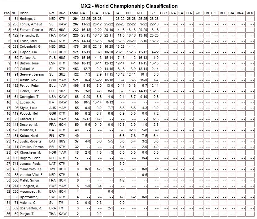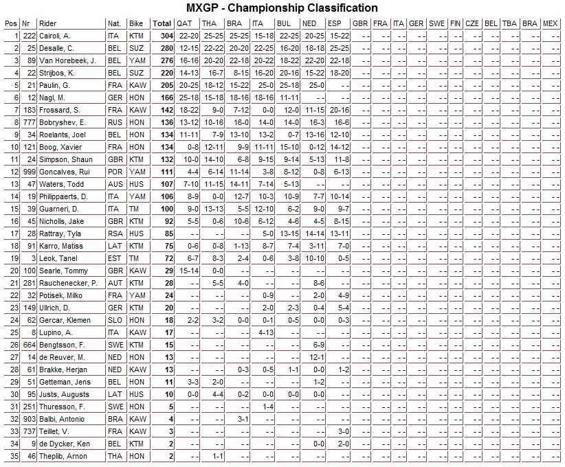 Российские гонщики Евгений Бобрышев ( MXGP ) и Александр Тонков (МХ2) заняли 11 и 15 места соответственно. Еще один российский спортсмен выступающий в классе МХ2 - Вячеслав Головкин занял 25-е место.