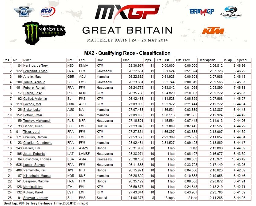 Предлагаем ознакомиться с результатами квалификационных заездов восьмого этапа Чемпионата мира 2014 - Гран-При Великобритании, который проходит в эти выходные на треке Мэттерли Бэсин.