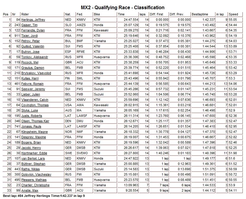 Итоги квалификационных заездов в классах МХ2 и MXGP...