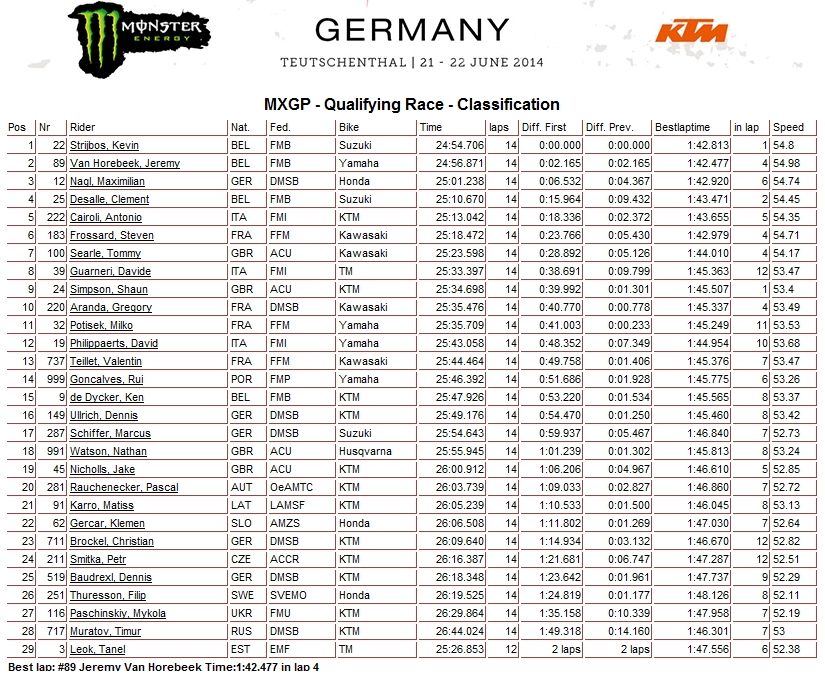 Сегодня на треке Теченталь прошли квалификационные заезды одиннадцатого этапа Чемпионата мира по мотокроссу 2014 - Гран-При Германии. Лучшее время показали - Джеффри Херлингс (МХ2) и Кевин Страйбос (MXGP).
