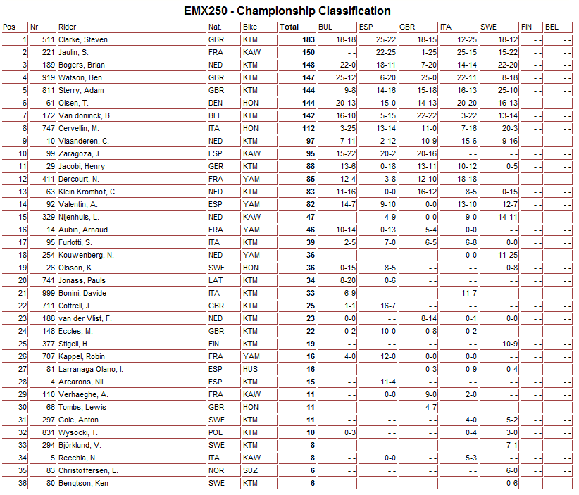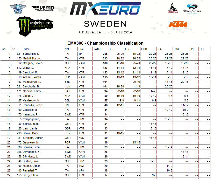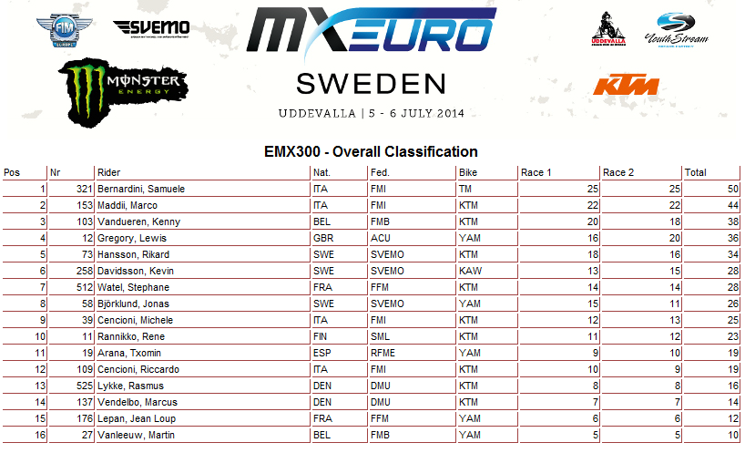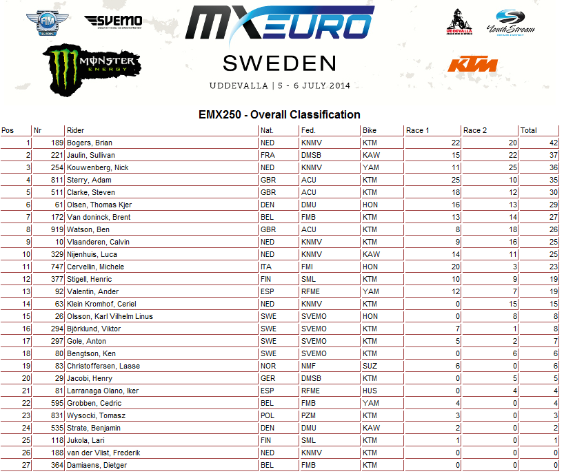 Чемпионат Европы 2014: Швеция (+ Видео). 06.07.2014 Роман Мишенев (_) Результаты пятого этапа и видео заездов Чемпионата Европы в классах ЕМХ250 и ЕМХ300... В этот уик-энд на треке в Уддевалла (Швеция) прошли заезды пятого этапа Чемпионата Европы в классах ЕМХ250 и ЕМХ300. Предлагаем ознакомиться с результатами соревнований. Пятый этап - результаты: Общий зачет: Видео: Комментарии Комментарии к этой статье запрещены.
