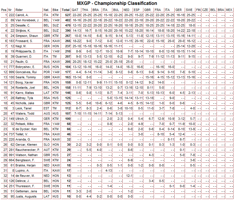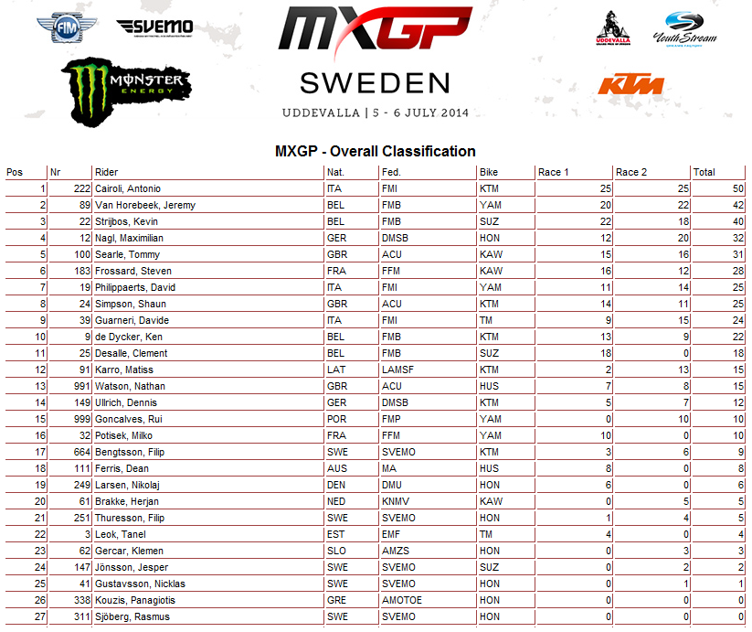 Первое место в классе МХ2 вновь у голландца Джеффри Херлингса, а в классе MXGP - очередную победу отпраздновал Антонио Кайроли.