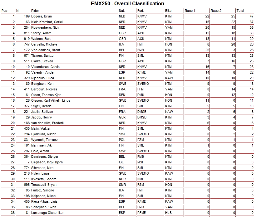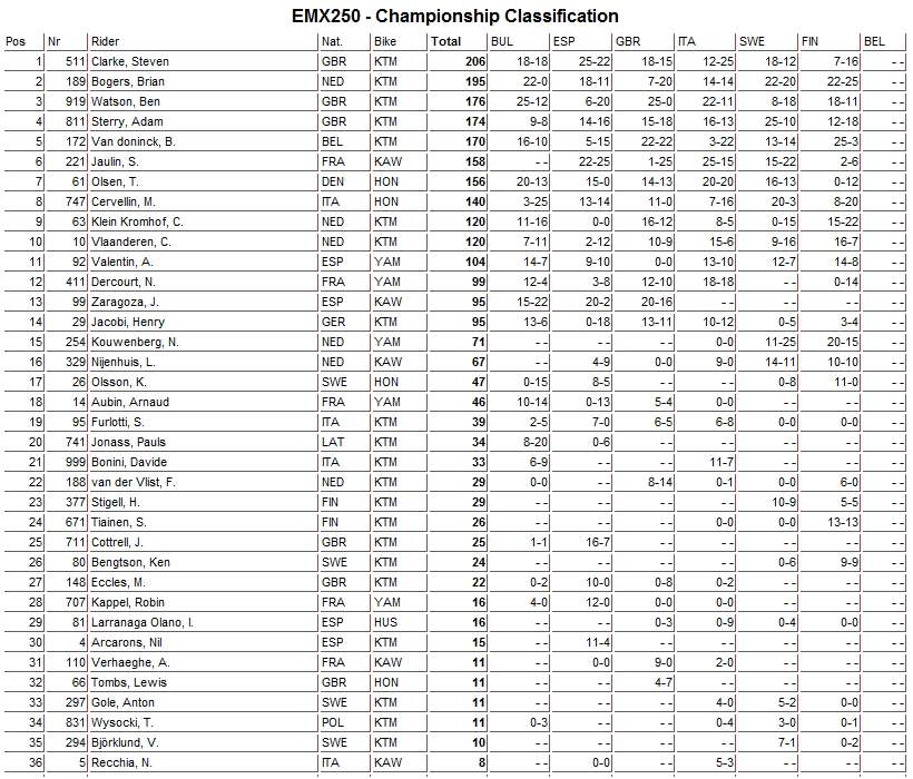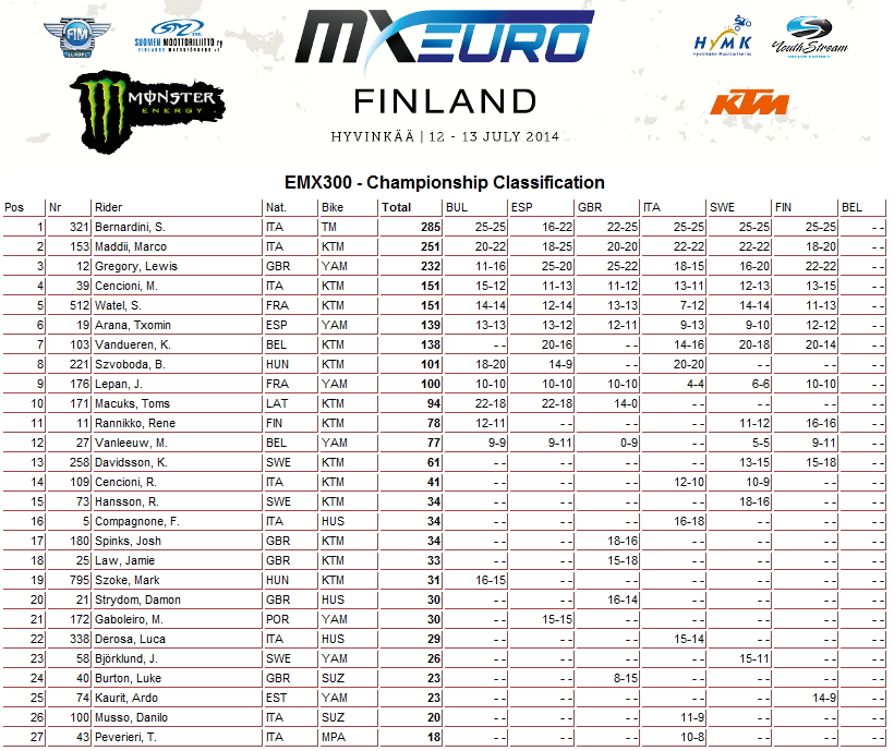 Чемпионат Европы 2014 - Финляндия (+ Видео). 13.07.2014 Роман Мишенев (_) Результаты шестого этапа и общий зачет в классах ЕМХ250 и ЕМХ300... Предлагаем ознакомиться с результатами шестого этапа Чемпионата Европы 2014 в классах ЕМХ250 и ЕМХ300, который прошел в эти дни в Финляндии в рамках Чемпионата мира. Результаты 6-го этапа: Общий зачет: Видео: Комментарии Комментарии к этой статье запрещены.