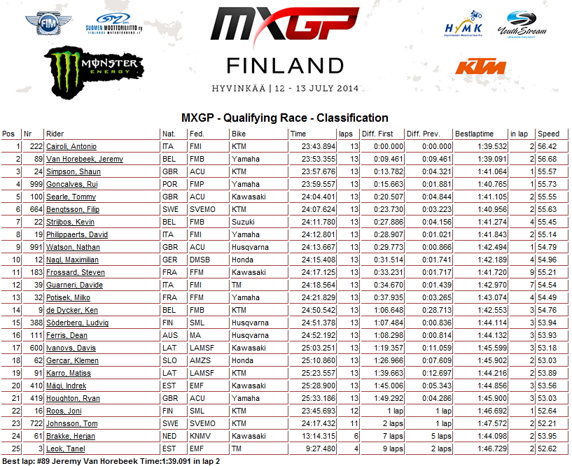 Только, что на треке в Hyvinkää закончились квалификационные заезды тринадцатого этапа Чемпионата мира 2014 - Гран-При Финляндии. Лучшее время в классе МХ2 у голландца Джеффри Херлингса, а в классе MXGP у Антонио Кайроли.