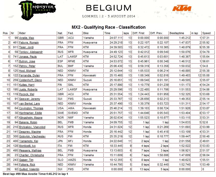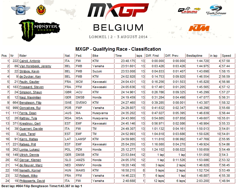 Лучшее время в классе МХ2 у Макса Энсти, а в классе MXGP у Антонио Кайроли.