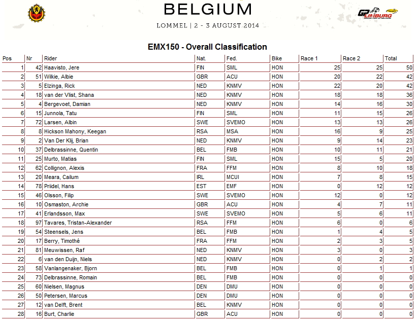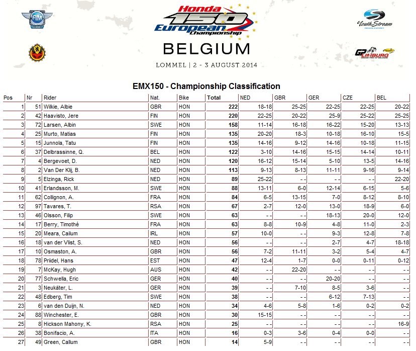 Победителем бельгийского этапа стал финн Джере Хаависто, но ему не хватило всего двух очков до "чемпионства", и Чемпионом Европы 2014 в классе ЕМХ150 становится Вилки Элби из Великобритании.