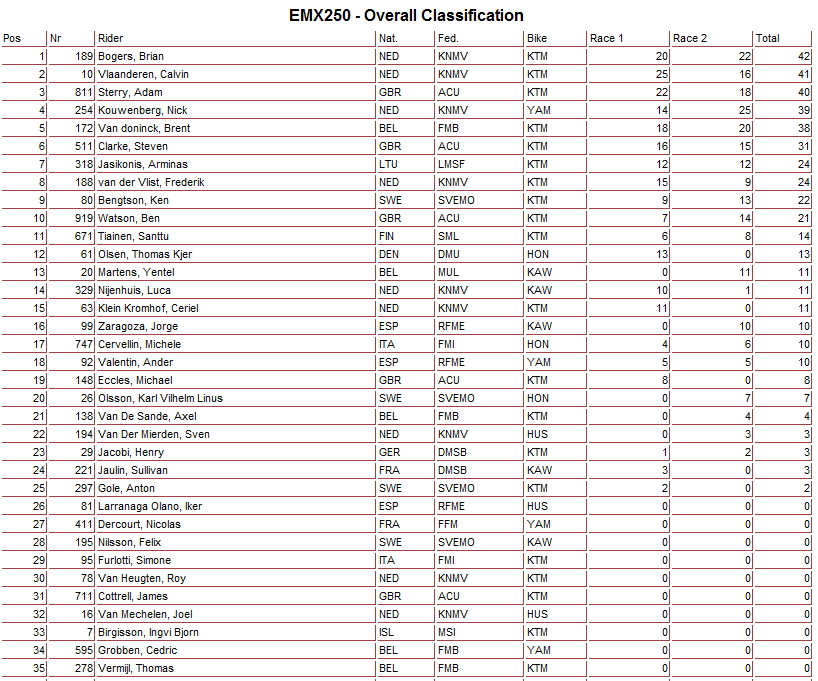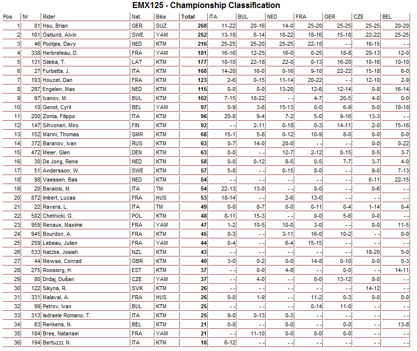 Результаты финального этапа в Бельгии и итоги чемпионата в классах ЕМХ125, ЕМХ150, ЕМХ250 и ЕМХ300...