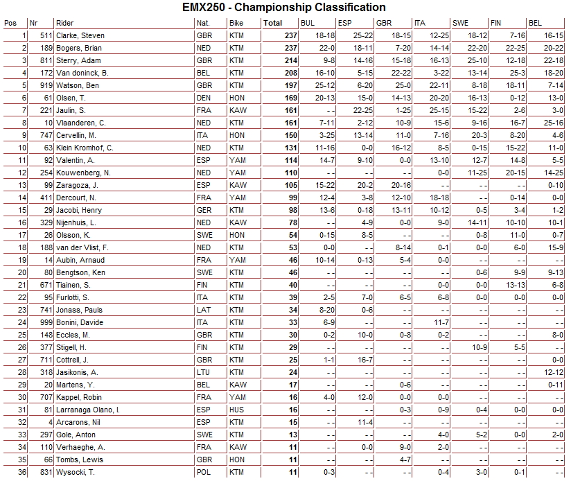 В классе ЕМХ250 чемпионский титул достался гонщику из Великобритании - Стивену Кларку, а на второй позиции закончил сезон голландец Брайан Богерс. Эти два гонщика набрали одинаковое количество очков в чемпионате по 237.
