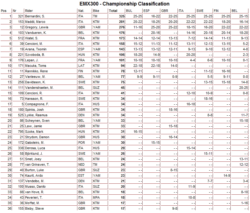 В классе ЕМХ300 выиграв пять этапов из семи, чемпионом стал итальянец Самуэль Бернардини на ТМ.