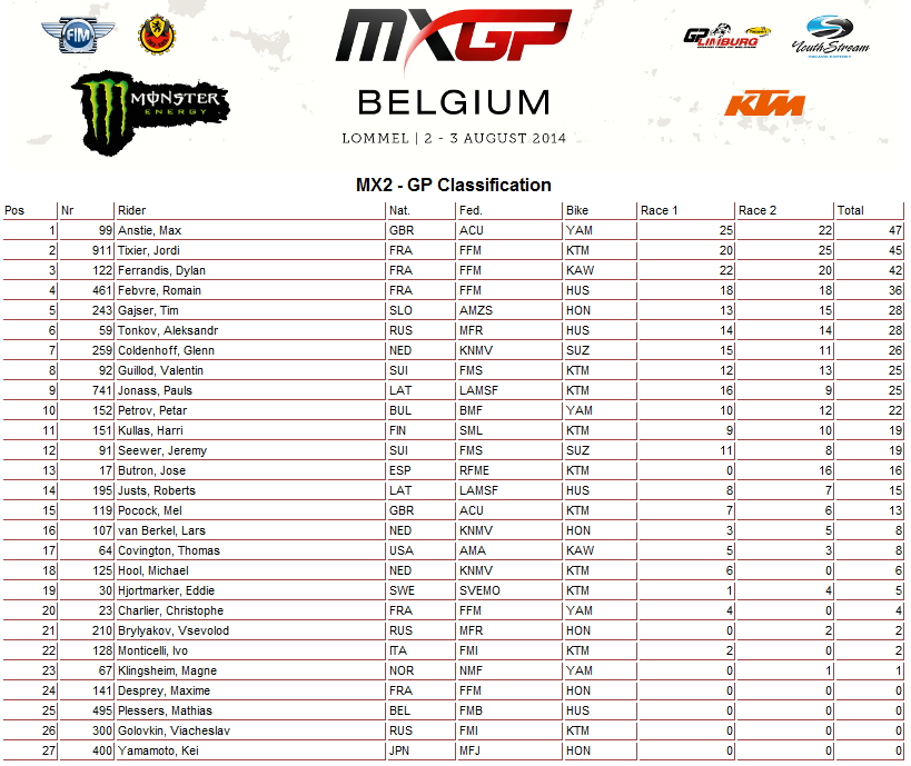 Победителем этапа в классе МХ2 стал англичанин Макс Энсти. Жорди Тиксье (номер 911, на фото) финишировал на второй позиции и теперь возможность стать чемпионом мира 2014 все ближе и ближе. С лидером чемпионата, голландцем Джеффри Херлингсом, его отделяет всего 57 очков.