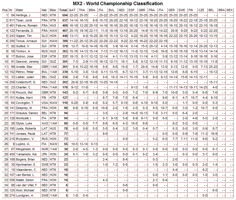 Результаты пятнадцатого этапа Чемпионата мира в классах МХ2 и MXGP...