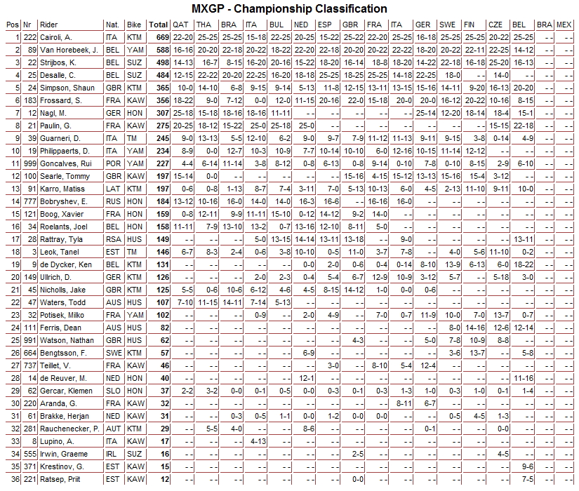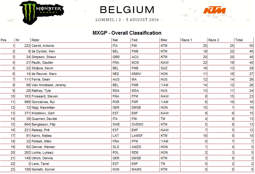 В классе MXGP абсолютную победу отпраздновал итальянец Тони Кайроли, выиграв оба заезда.