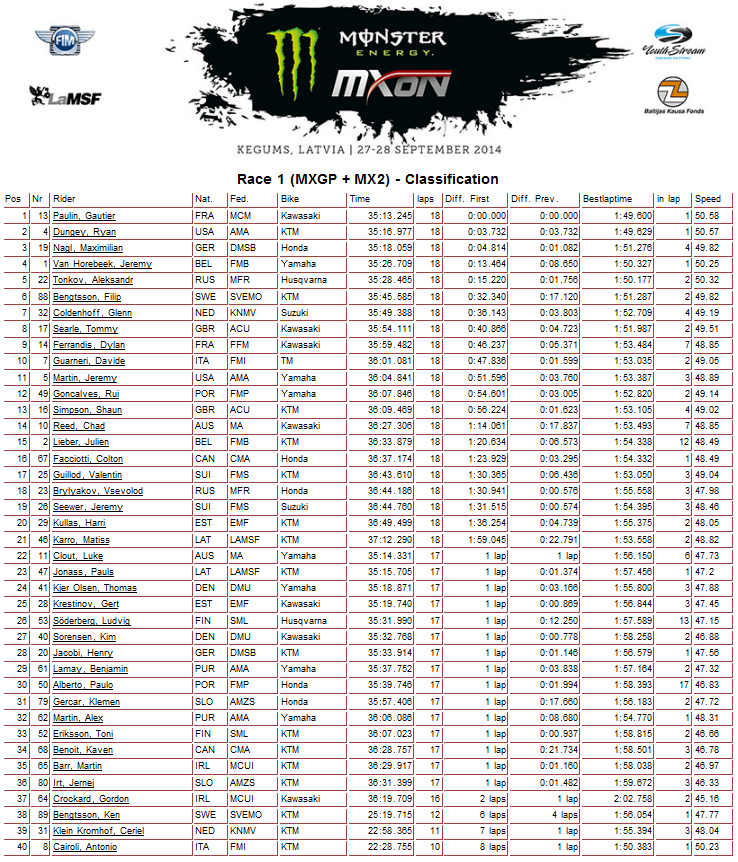 Только, что закончился первый заезд (MXGP + MX2) Мотокросса Наций 2014 проходящего в эти дни в Кегумсе.
