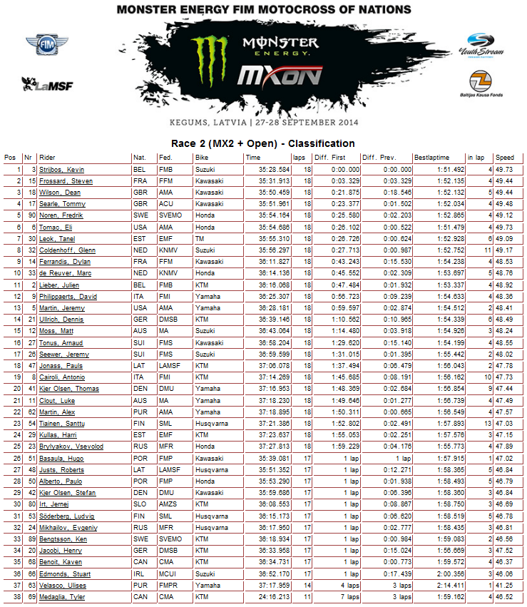 Победу во втором заезде Мотокросса Наций 2014 одержал бельгиец Кевин Страйбос. Россияне Всеволод Брыляков и Евгений Михайлов на 25-й и 32-й позициях соответственно.