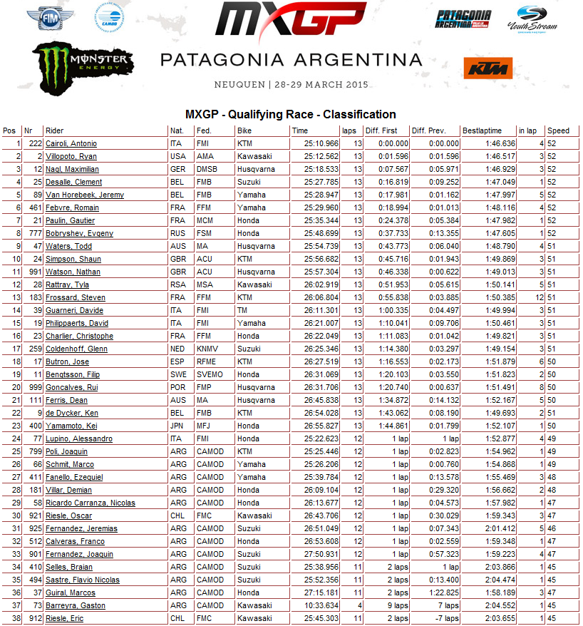 Гран-При Аргентины - Квалификация MXGP 28.03.2015 Роман Мишенев (_) Результаты квалификационного заезда в классе MXGP. Победителем квалификационного заезда в классе MXGP стал итальянец Антонио Кайроли. Райан Виллопото на второй позиции. Российский пилот Евгений Бобрышев закончил квалификацию восьмым.. Комментарии Комментарии к этой статье запрещены.