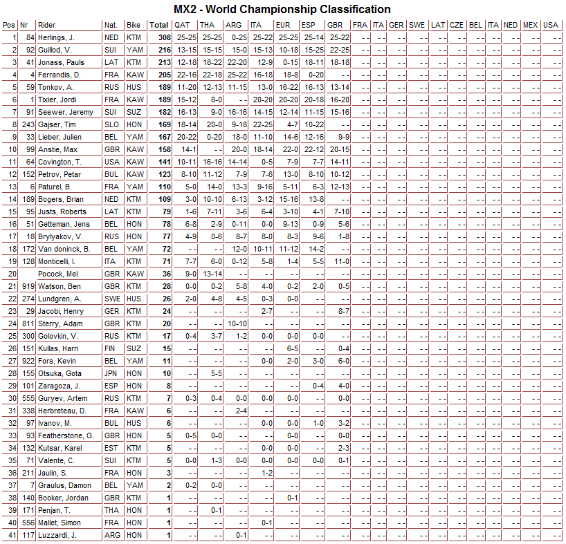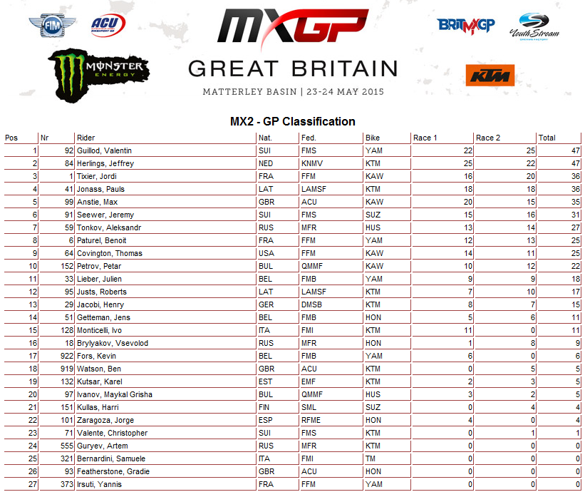Заезды в классе МХ2 завершились общей победой швейцарца Валентина Гуиилода, который набрал равное количество очков с голландцем Джеффри Херлингсом, который довольствовался второй позицией.
